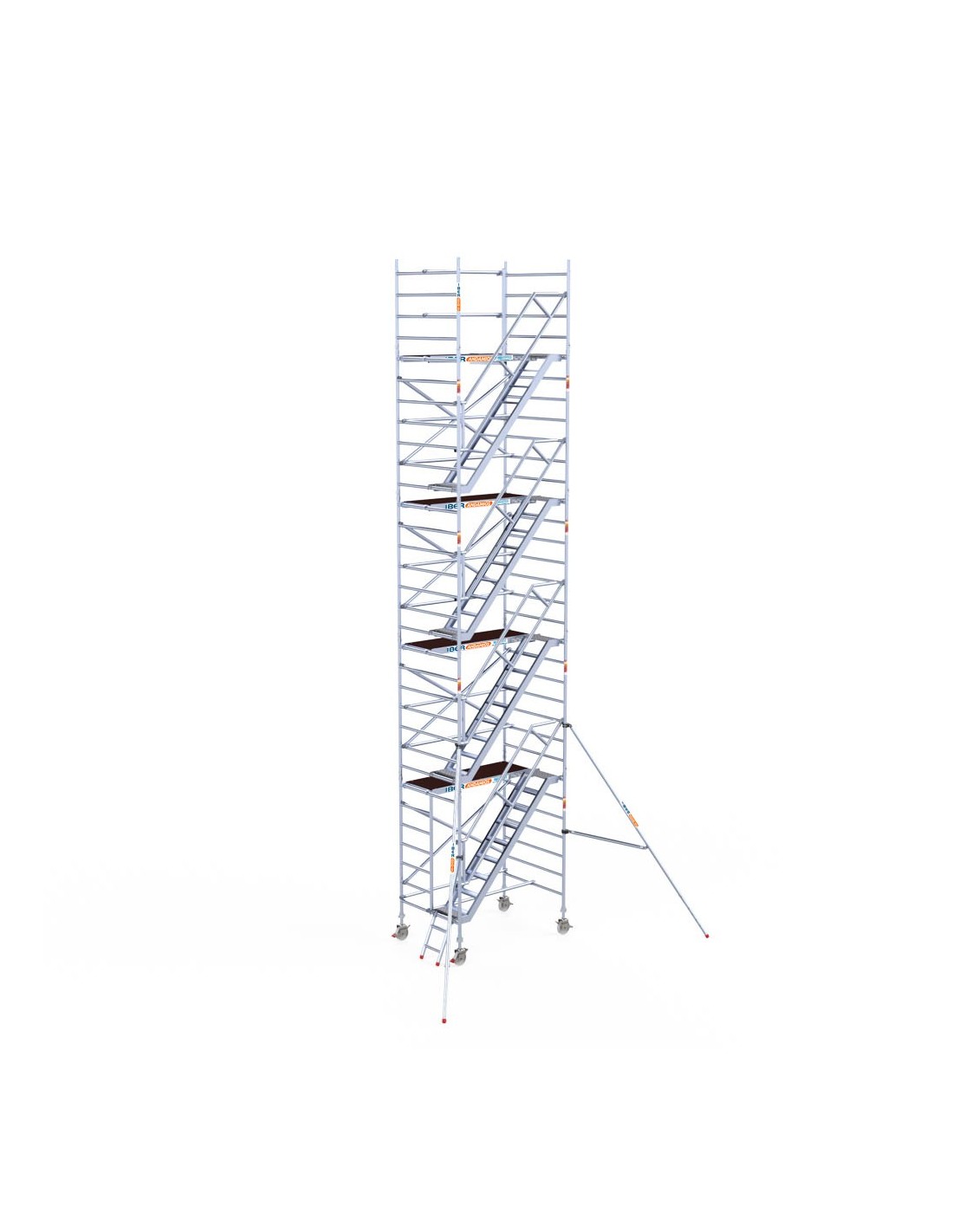 Andamio móvil tipo torre con escaleras 135x190 de 10,20 metros altura de trabajo. Facilita el acceso a la plataforma de trabajo de tu torre móvil gracias a las escaleras de esta torre de andamio con escaleras. Se trata de un modelo, no solo práctico, sino también muy fácil de montar y desmontar. Esta torre móvil con escaleras está fabricada en aluminio de gran calidad, lo que hace que sea muy resistente y estable.
