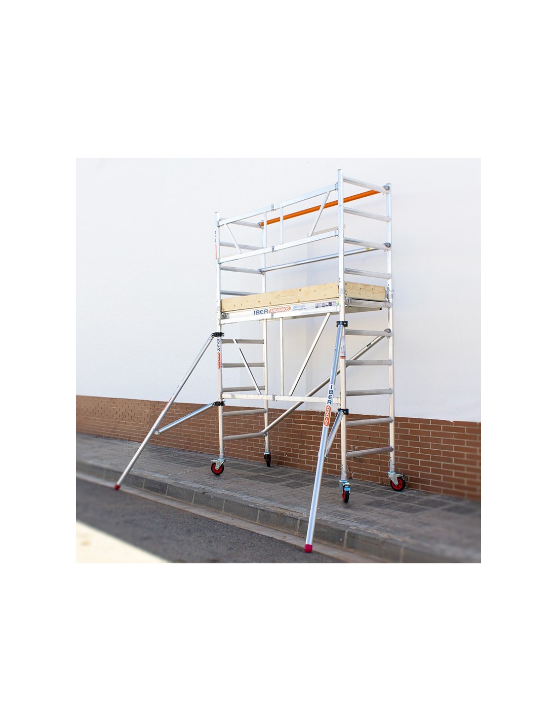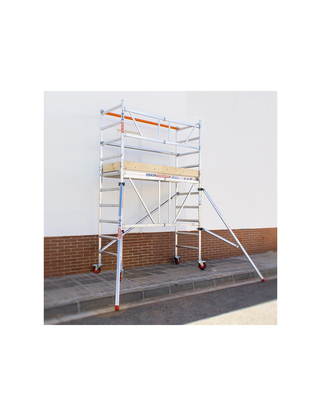 Andamio de aluminio plegable 75x190 y 3,85 metros altura de trabajo con rodapiés y estabilizadores, de gran calidad y polivalencia, ya que puede usarse en todo tipo de obras. Fácil de manejar y montar, puede incluso desplazarlo sin necesidad de desmontarlo.