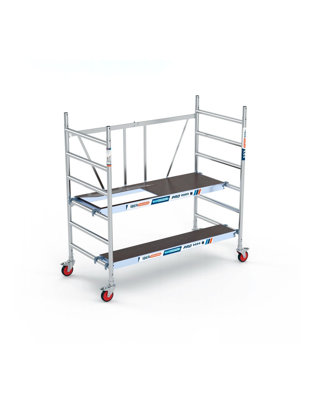 Andamio plegable de aluminio 90x190 de 3 metros de altura de trabajo con trampilla y con plataforma complementaria de 190x30 cm. Gracias a esta plataforma, puedes combinar la composición de tu andamios plegable en distintas posiciones, ya sea para aumentar el ancho de la plataforma de trabajo o para utilizarla como lugar para colocar herramientas u otros objetos. Un modelo de gran calidad pensado para los profesionales gracias a su resistencia y versatilidad. Está especialmente pensado para trabajos de interior, gracias a su tamaño y aspecto compacto, lo que le permitirá desplazador donde quiera sin necesidad de desmontarlo. Fácil de instalar, tenlo listo en un minuto.