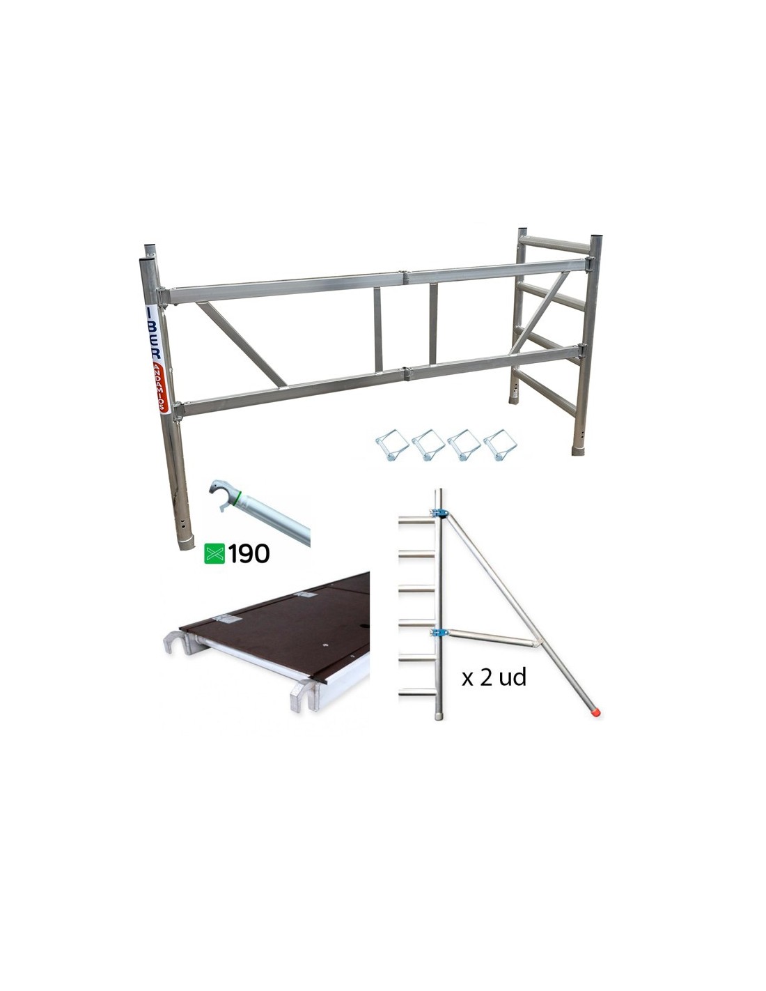 Módulo ampliable de 4,70 metros a 5,70 metros para andamio plegable con trampilla. Fácil de montar y desmontar, así como de guardar y transportar. Ampliable hasta 7,50 metros altura de trabajo. Sus dimensiones son de 75 cm de ancho por 190 cm de longitud.