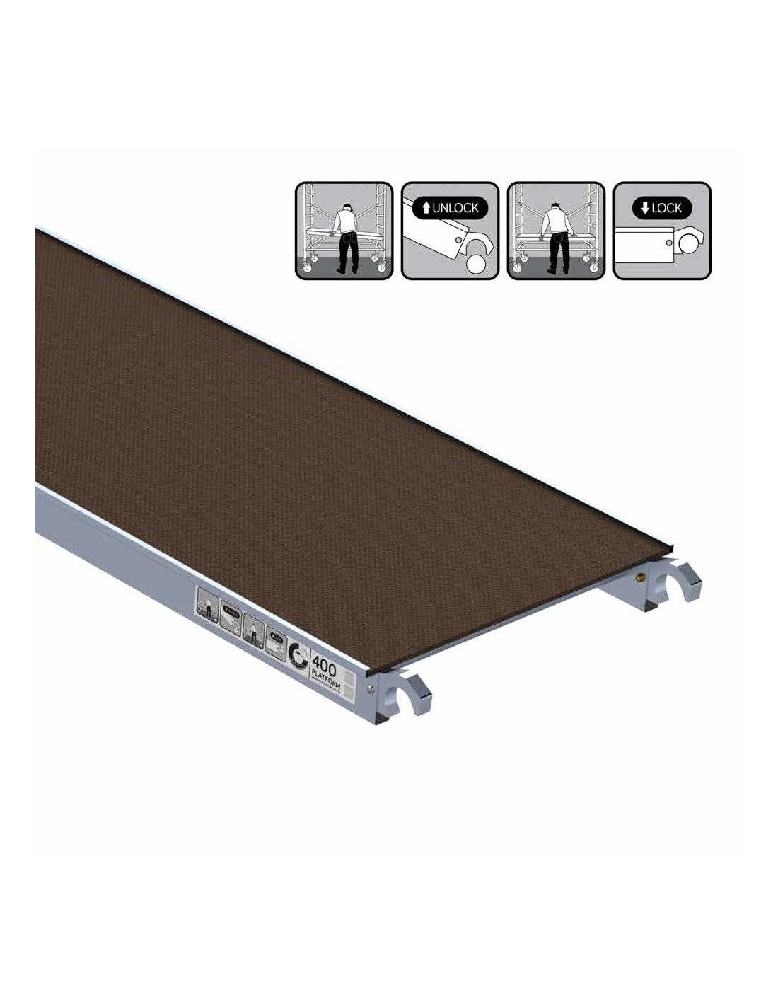 Plataformas Plataforma CON trampilla 250 cm para torre móvil y andamio plegable | XTREM ASC GROUP 10203012 271,87 € Plataforma CON trampilla de 250 cm de longitud XTREM, válida tanto para andamios móviles tipo torre como para andamios plegables. Su ancho es de 60 cm y está fabricada en un aluminio de gran calidad y soldadura. Carga máxima de 200 kg/m2. Añadir al carrito