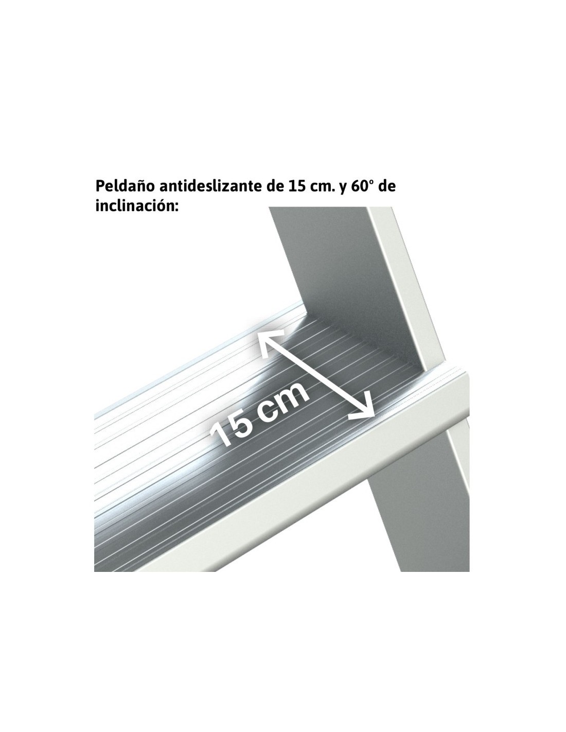 Escalera profesional con plataforma de 15 peldaños, voladizo y 4 ruedas, disponible de 5 a 17 peldaños según preferencias (consultar catálogo). Fabricada en aluminio, esta escalera profesional cuenta con una amplia plataforma de trabajo y acceso a través de una escalera de 60º de inclinación. Esta escalera está pensada para trabajar en lugares donde se encuentran obstáculos en el suelo ya que se fabrica con vuelos de distintos largos, siendo 50 cm el máximo. Gracias a su material, es ligera y robusta al mismo tiempo, lo que permite su fácil transporte y fuerte estructura. Perfecta para uso profesional e industrial.