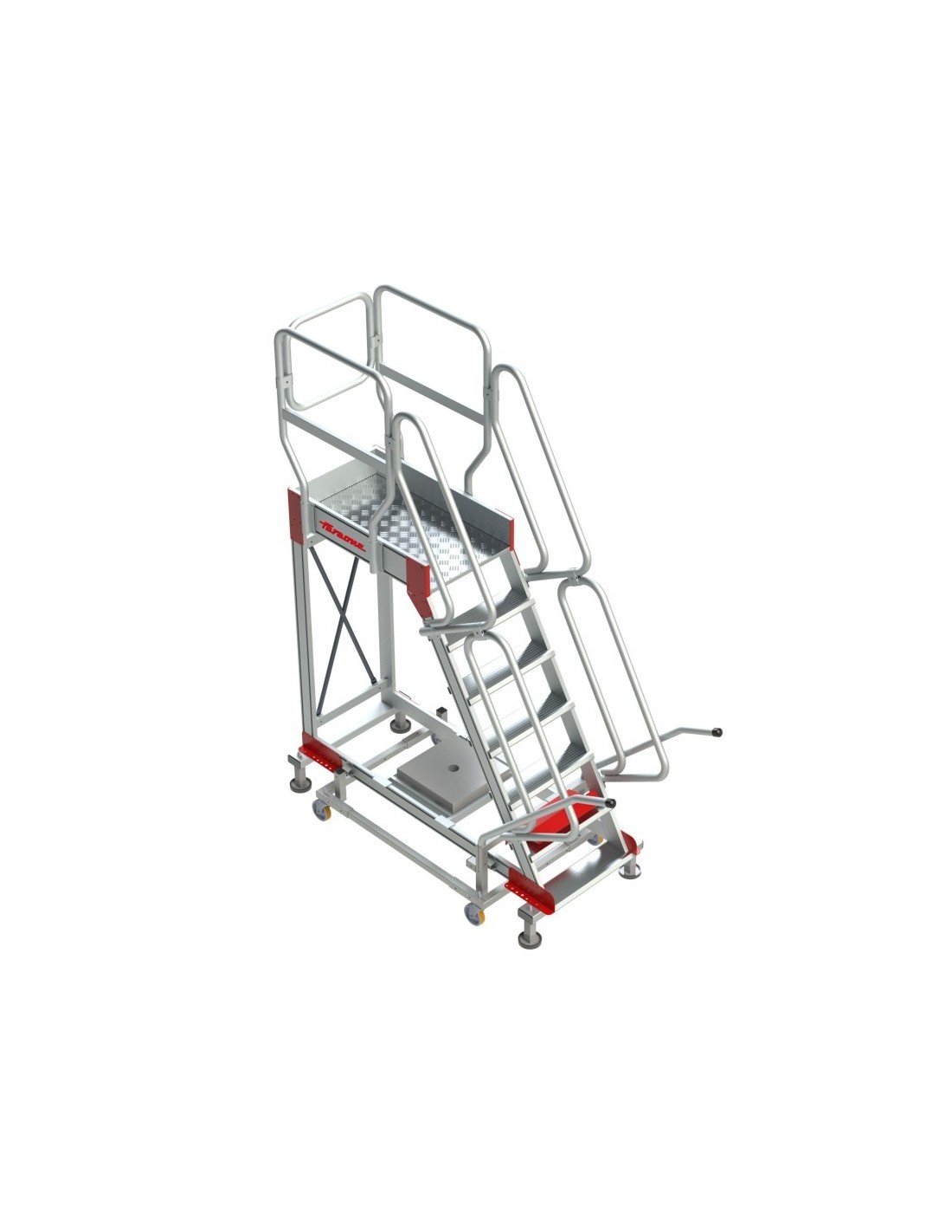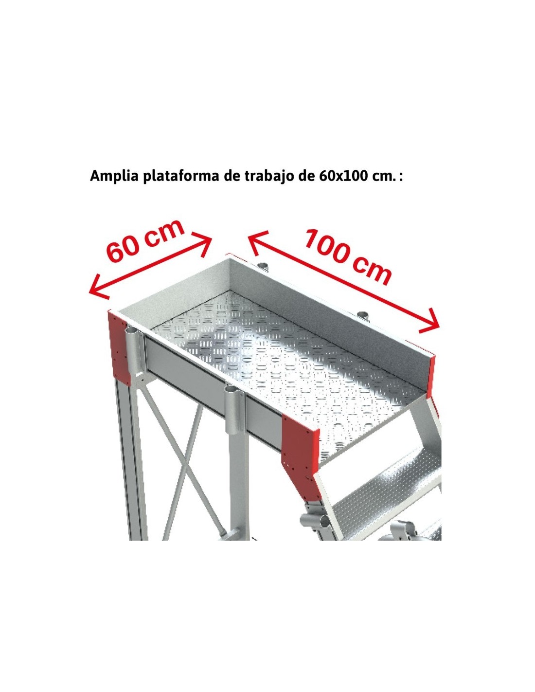 Escalera profesional con plataforma y ruedas de 10 peldaños, disponible de 4 a 17 peldaños según preferencias (consulte catálogo). Fabricada en aluminio, esta escalera profesional cuenta con una plataforma de trabajo de 60x100 cm y acceso a través de una escalera de 60º de inclinación. Gracias a su material, es ligera y robusta al mismo tiempo, lo que permite su fácil transporte y fuerte estructura. Perfecta para uso profesional e industrial.