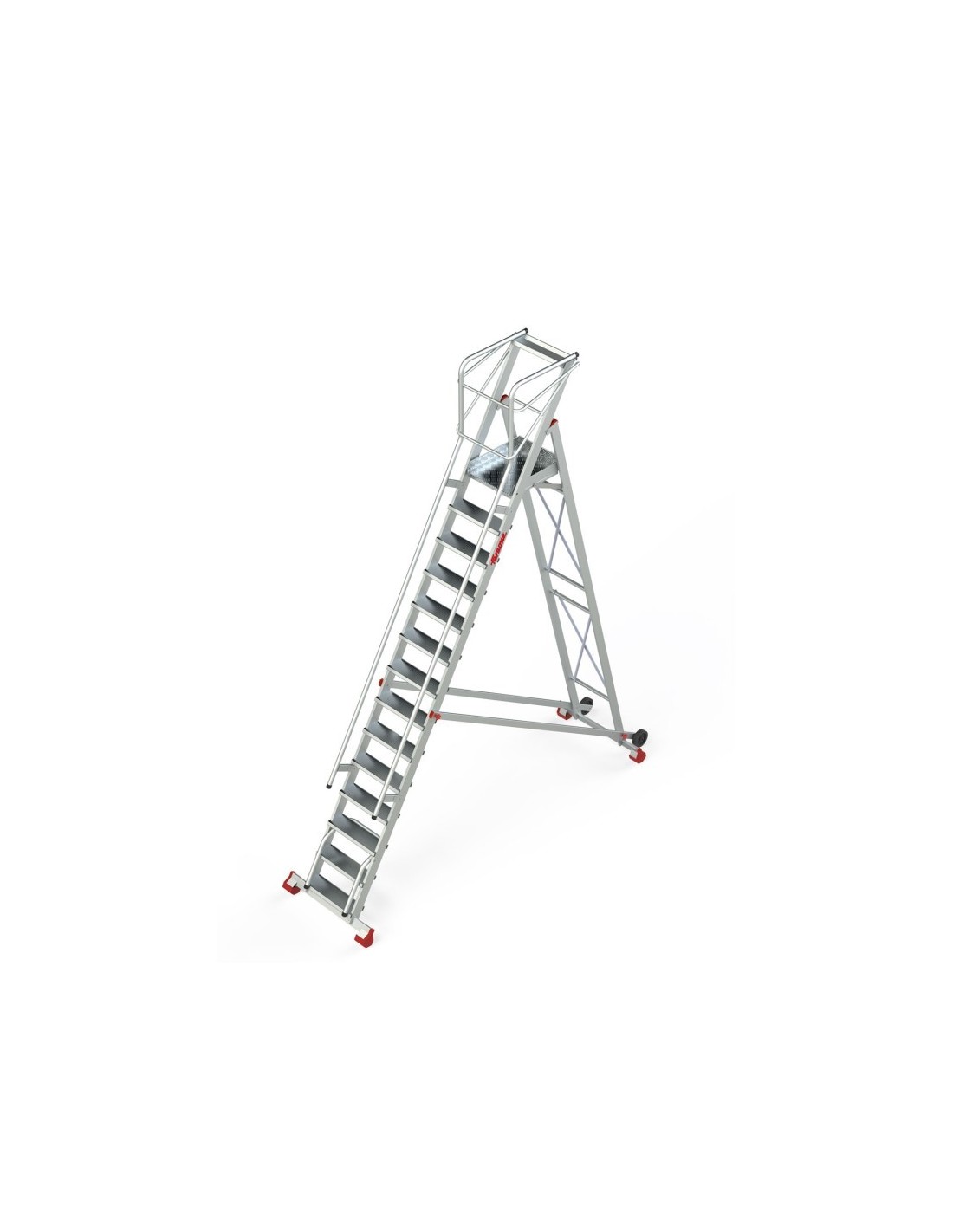 Escalera profesional de almacén de 14 peldaños, fabricada en aluminio perfecta para uso intensivo. Esta escalera profesional para almacén es ligera y robusta al mismo tiempo, lo que facilita su traslado y uso. La escalera de almacén se desplaza gracias a dos asas que la levantan para que las ruedas apoyen el suelo.