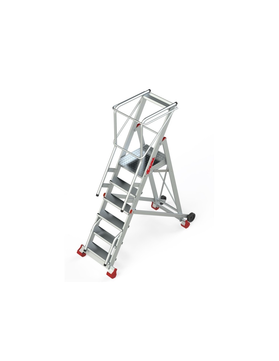 Escalera profesional de almacén de 6 peldaños, fabricada en aluminio perfecta para uso intensivo. Esta escalera profesional para almacén es ligera y robusta al mismo tiempo, lo que facilita su traslado y uso. La escalera de almacén se desplaza gracias a dos asas que la levantan para que las ruedas apoyen el suelo.