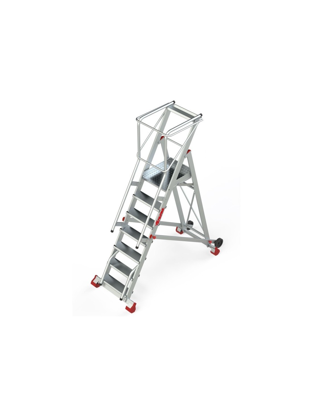 Escalera profesional de almacén de 7 peldaños, fabricada en aluminio perfecta para uso intensivo. Esta escalera profesional para almacén es ligera y robusta al mismo tiempo, lo que facilita su traslado y uso. La escalera de almacén se desplaza gracias a dos asas que la levantan para que las ruedas apoyen el suelo.