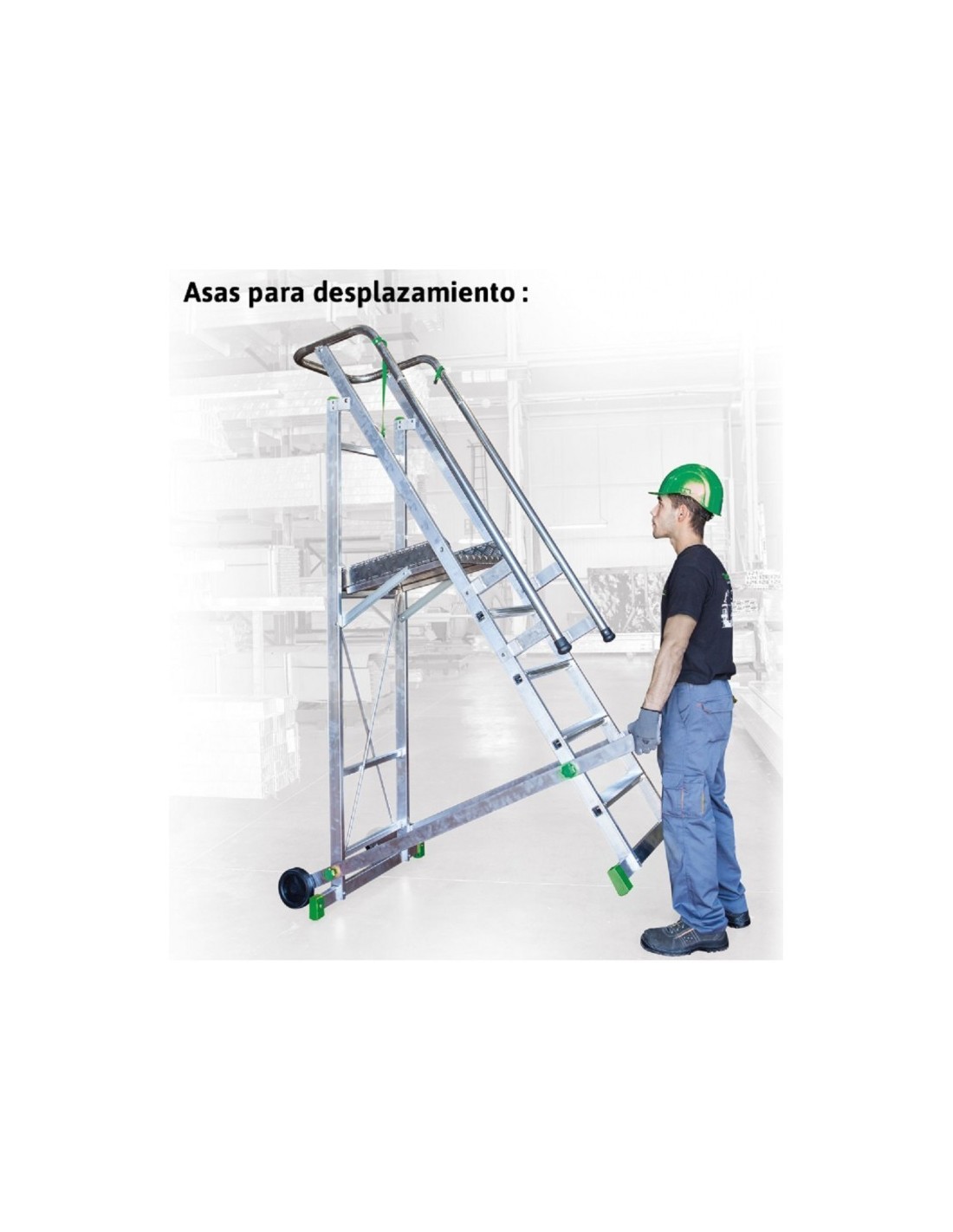 Escalera profesional plegable de 8 peldaños. Esta escalera de almacén está fabricada en aluminio y cuenta con una amplia plataforma de trabajo antideslizante. Puede desplazar esta escalera de almacén profesional de forma muy sencilla gracias a las dos asas que permiten levantarla y moverla gracias a sus ruedas.