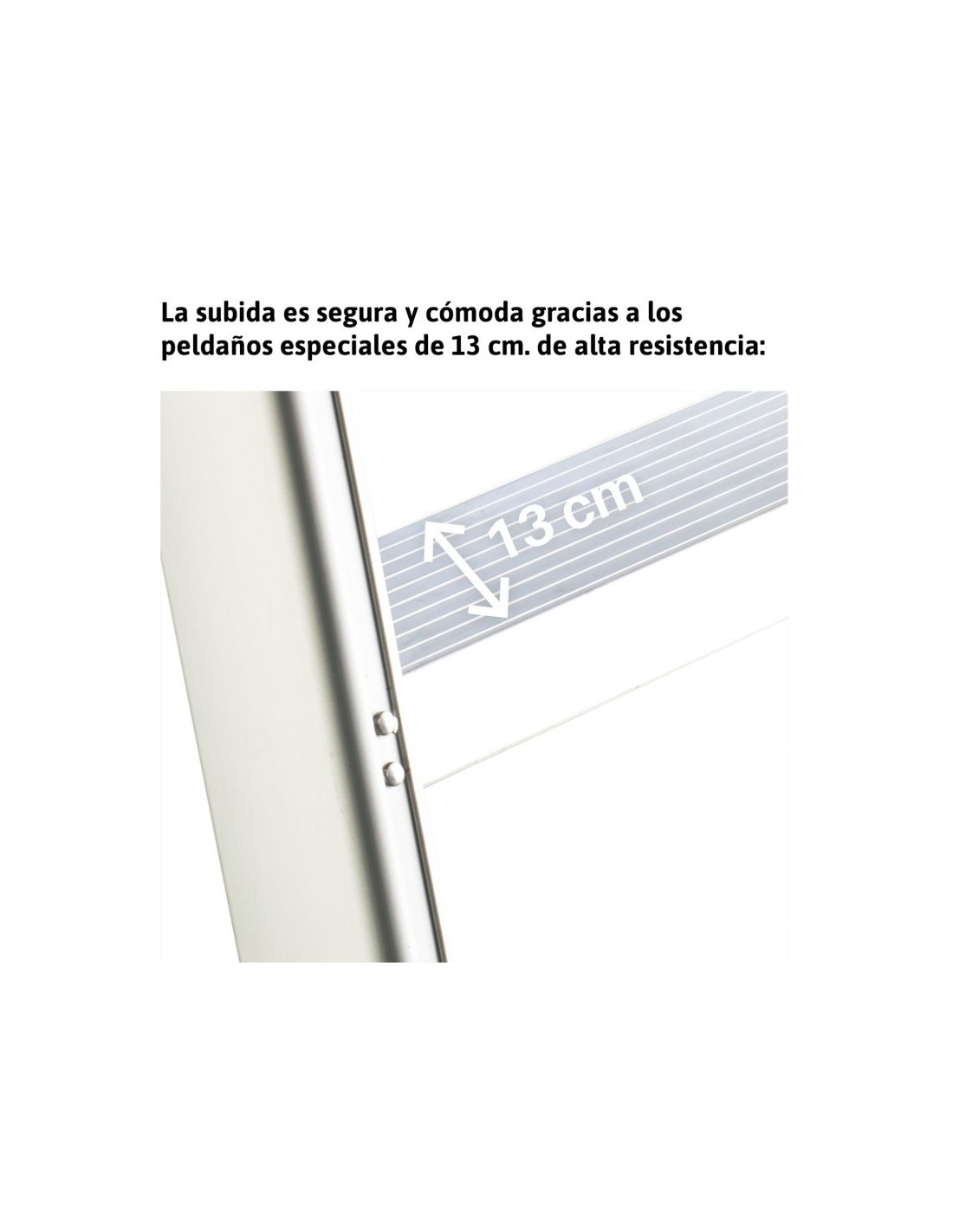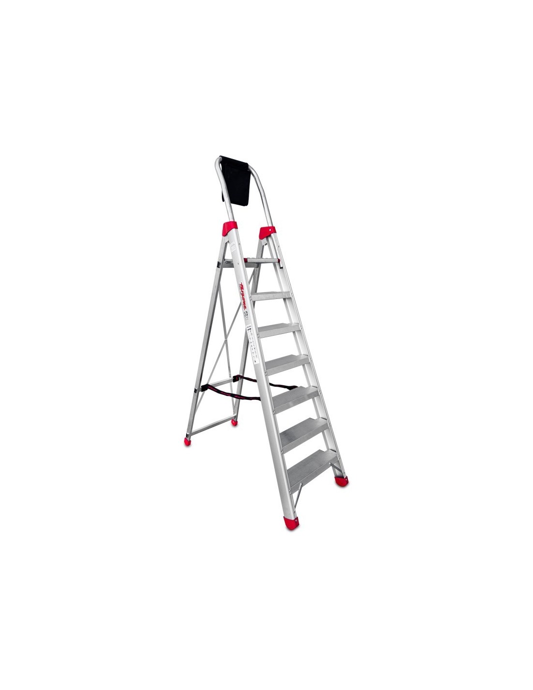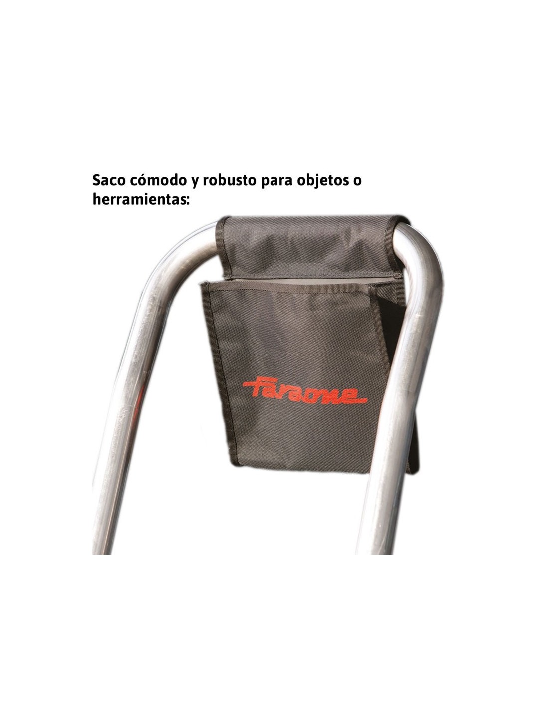 Escalera profesional de almacén de uso intensivo y de 7 peldaños. Esta escalera profesional está fabricada en aluminio y cuenta con montantes tipo C que sirven para acoplar peldaños de 130 mm de ancho. Además, cuenta con un saco portaherramientas que facilitará aún más su trabajo.