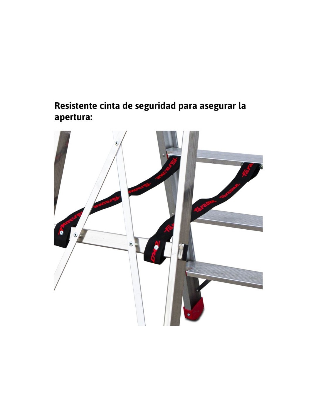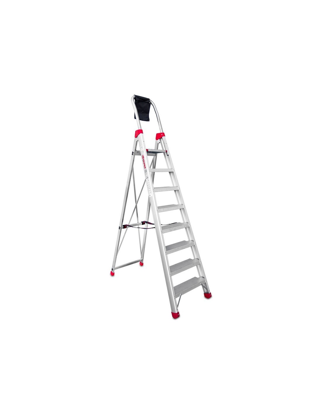 Escalera profesional de almacén de uso intensivo y de 8 peldaños. Esta escalera profesional está fabricada en aluminio y cuenta con montantes tipo C que sirven para acoplar peldaños de 130 mm de ancho. Además, cuenta con un saco portaherramientas que facilitará aún más su trabajo.