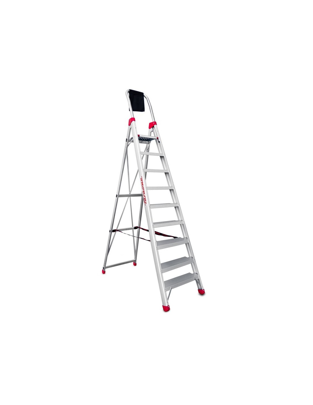 Escalera profesional de almacén de uso intensivo y de 9 peldaños. Esta escalera profesional está fabricada en aluminio y cuenta con montantes tipo C que sirven para acoplar peldaños de 130 mm de ancho. Además, cuenta con un saco portaherramientas que facilitará aún más su trabajo.