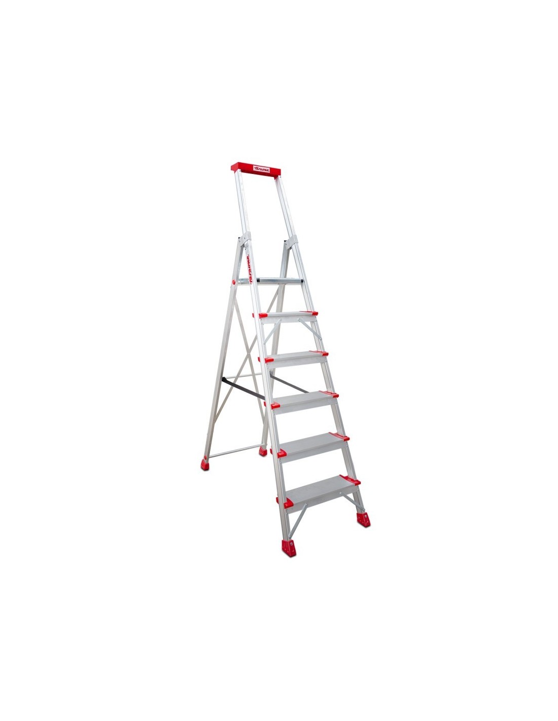 Escalera profesional de almacén ELEGANCE, fabricada en aluminio y con seis peldaños. Esta escalera de almacén dispone de un sistema de refuerzos que la hacen aún más segura y estable. Tanto su plataforma de trabajo como sus peldaños son de perfil antideslizante para evitar riesgo de caídas.