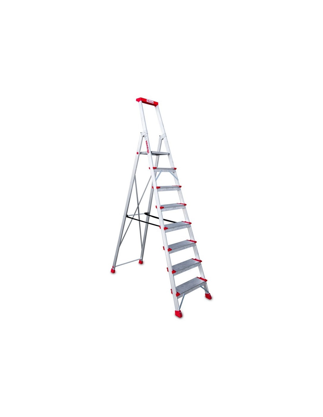 Escalera profesional de almacén ELEGANCE, fabricada en aluminio y con ocho peldaños. Esta escalera de almacén dispone de un sistema de refuerzos que la hacen aún más segura y estable. Tanto su plataforma de trabajo como sus peldaños son de perfil antideslizante para evitar riesgo de caídas.