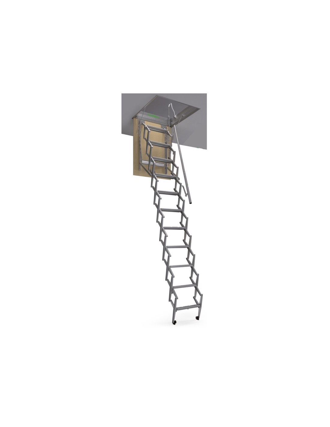 Escalera escamoteable para techo, fabricada en acero galvanizado. Esta escalera profesional escamoteable está disponible en distintas medidas de hueco en techo. Peldaños antideslizantes de 10 cm y altura de 3 metros hasta el suelo. Esta escalera escamoteable cumple con la normativa europea vigente EN 14975.