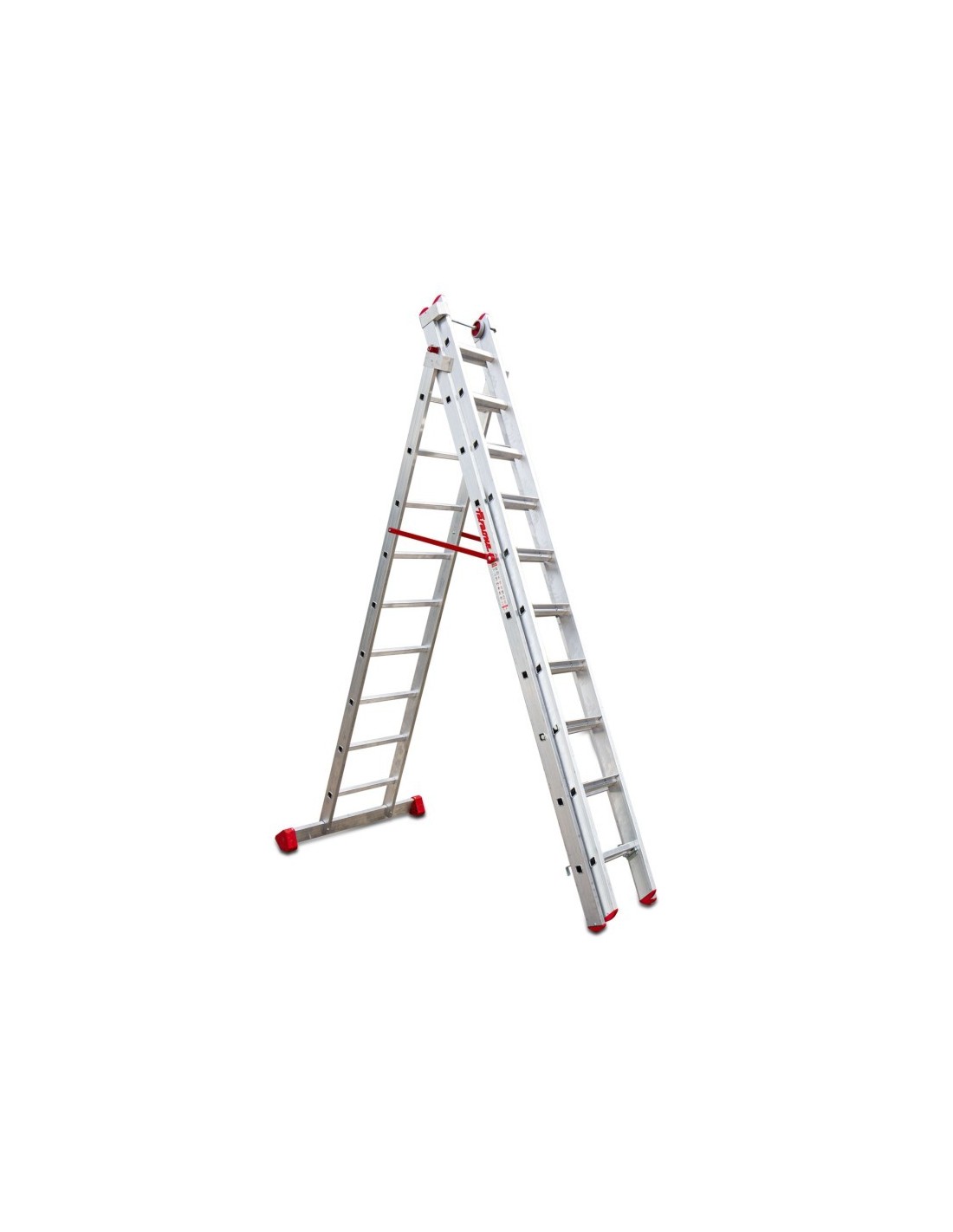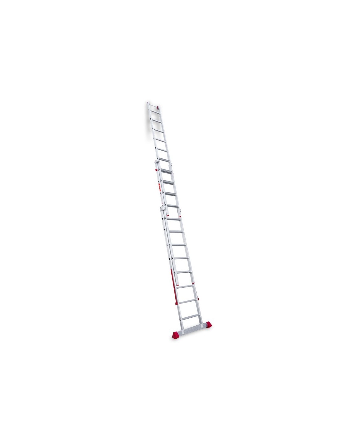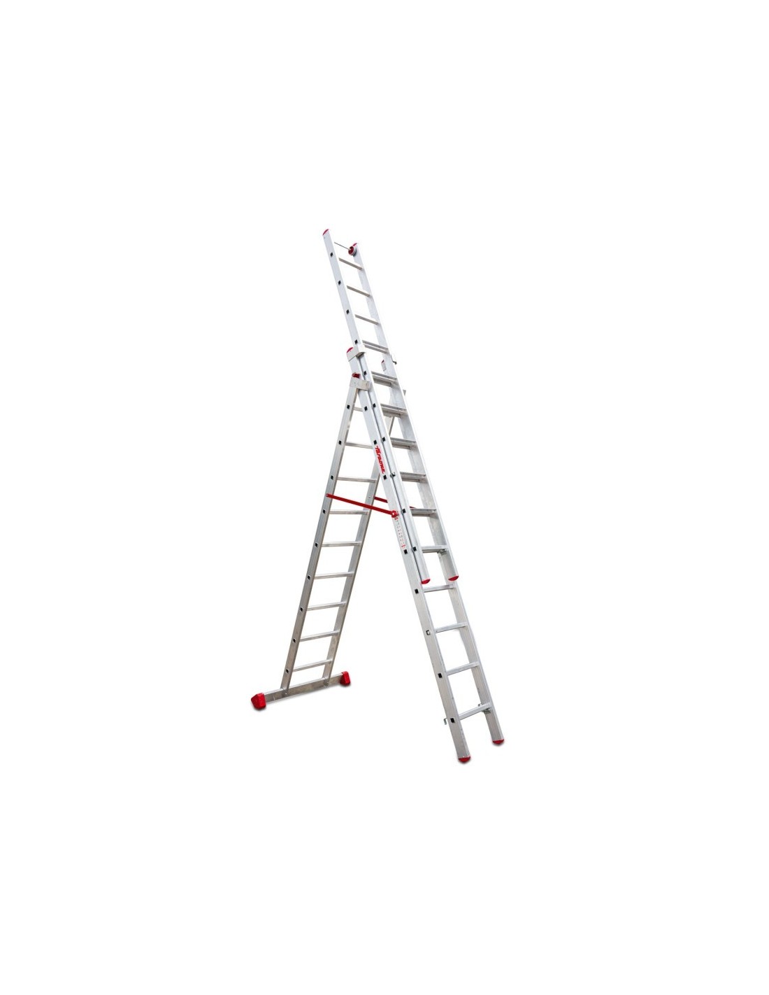 Escalera profesional multiusos EN1500 de tres tramos y 10 peldaños. Esta escalera multiusos está fabricada en aluminio y sus dos tramos pueden extenderse de forma que pueda utilizarse contra una pared. Además, también puede usarse en suelos irregulares como en aceras o escaleras gracias a que puede usarse en desnivel.
