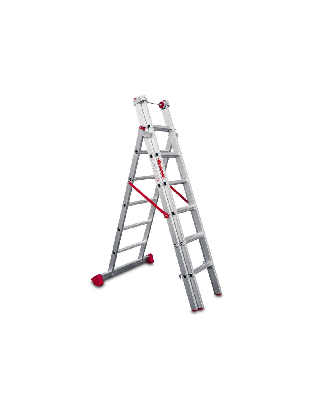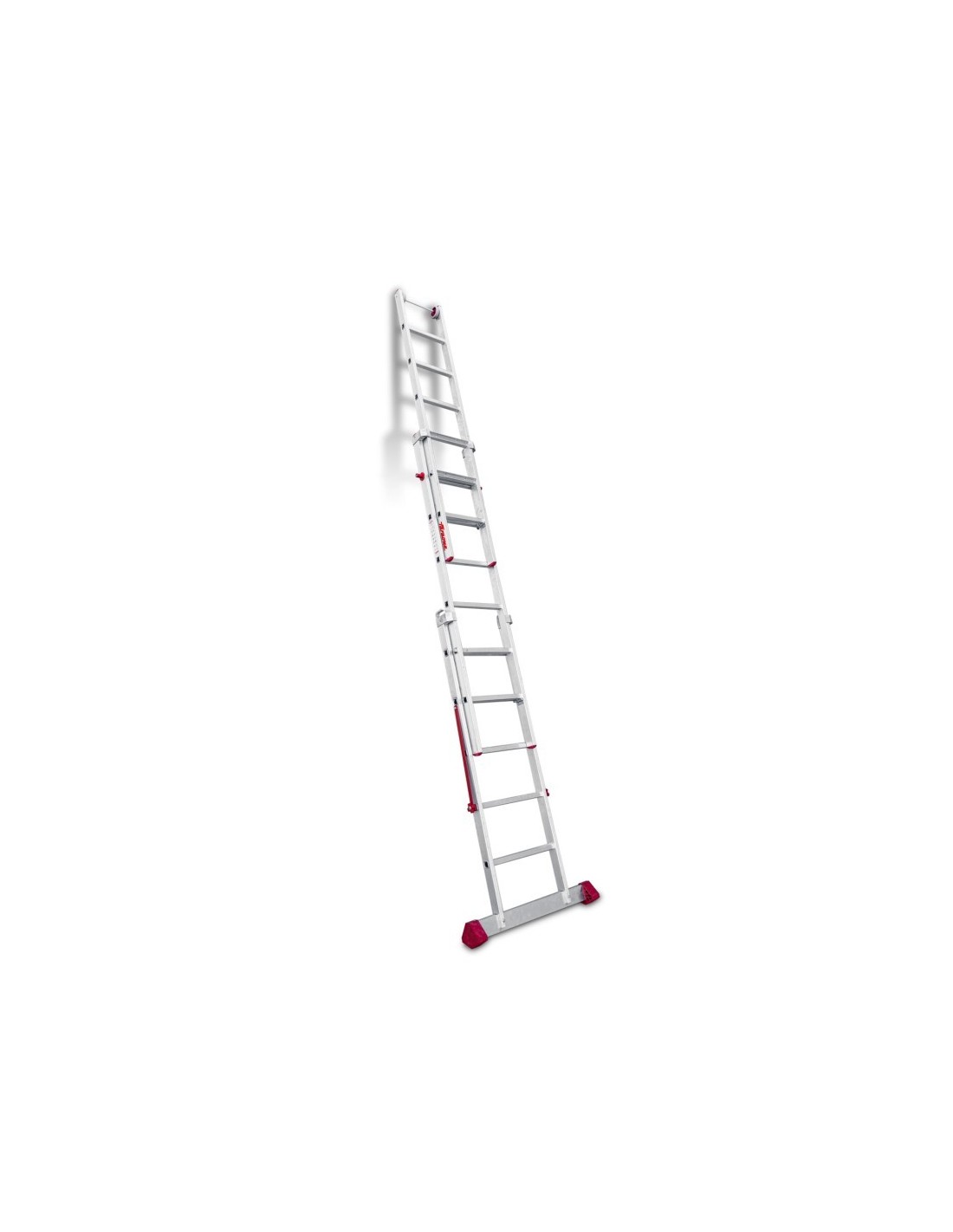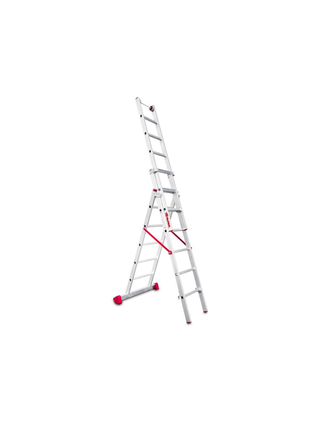 Escalera profesional multiusos EN1500 de tres tramos y 6 peldaños. Esta escalera multiusos está fabricada en aluminio y sus dos tramos pueden extenderse de forma que pueda utilizarse contra una pared. Además, también puede usarse en suelos irregulares como en aceras o escaleras gracias a que puede usarse en desnivel.