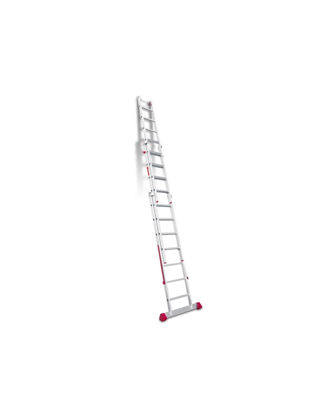 Escalera profesional multiusos EN1500 de tres tramos y 8 peldaños. Esta escalera multiusos está fabricada en aluminio y sus dos tramos pueden extenderse de forma que pueda utilizarse contra una pared. Además, también puede usarse en suelos irregulares como en aceras o escaleras gracias a que puede usarse en desnivel.