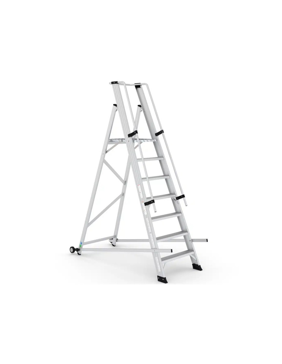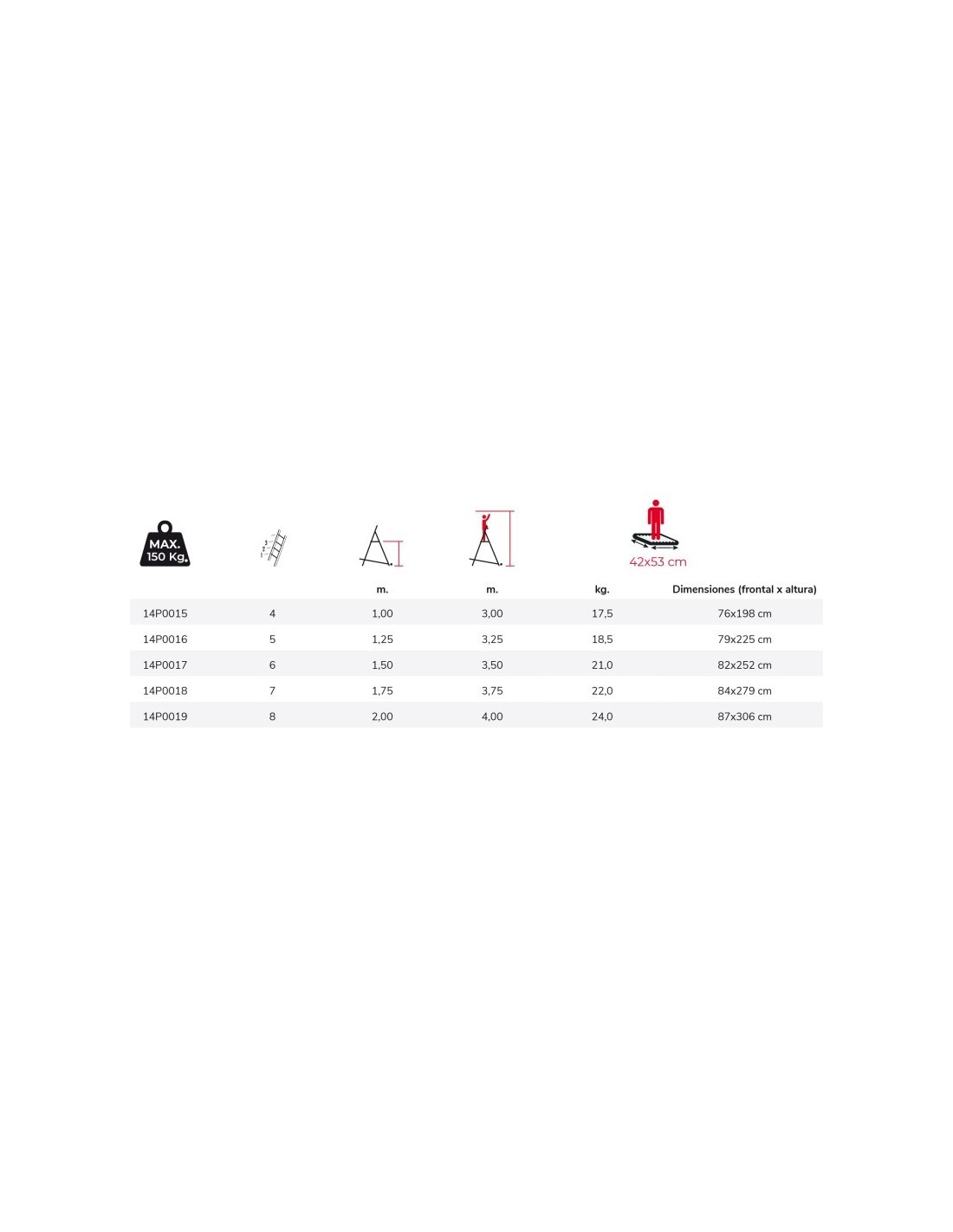 Escalera profesional SITRA con estructura soldada en aluminio de 7 peldaños. Esta escalera profesional ofrece una gran resistencia y estabilidad en todo momento, gracias a su completo equipamiento, sus sistema de plegado y su resistente diseño.