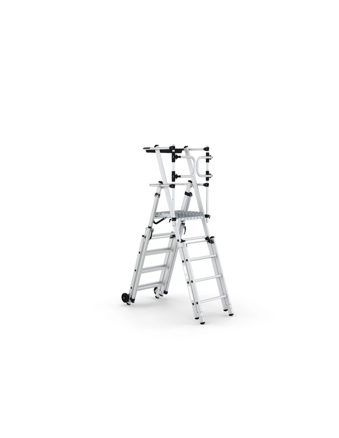 Escalera profesional telescópica JANUS fabricada en aluminio para uso profesional de 4 a 5 peldaños. Esta escalera profesional cuenta con estabilizadores telescópicos que permiten regular la altura. Su plataforma, además, ofrece un cómo espacio de trabajo gracias a sus dimensiones (51x46 cm).