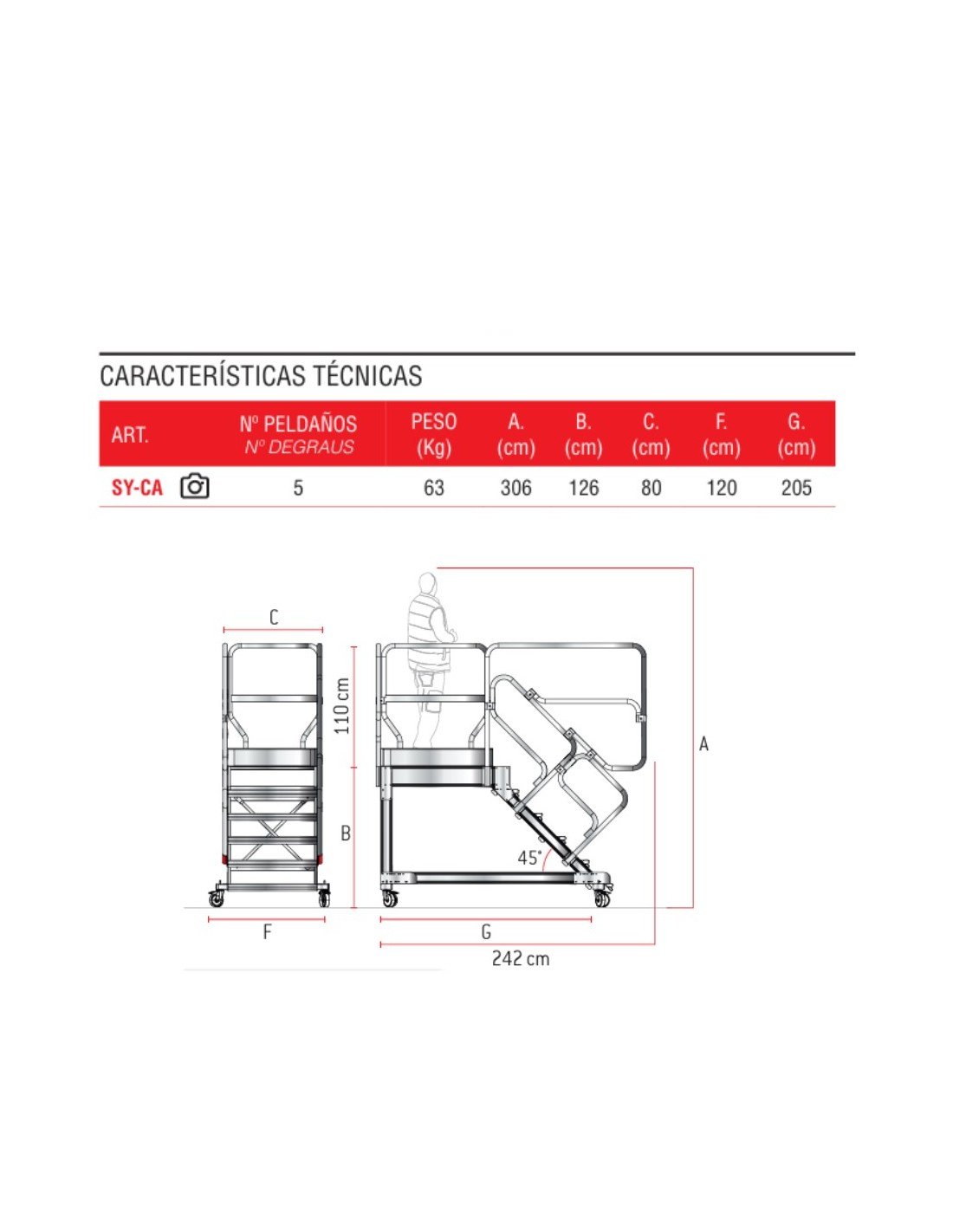 - Inclinación 45º para una subida cómoda.