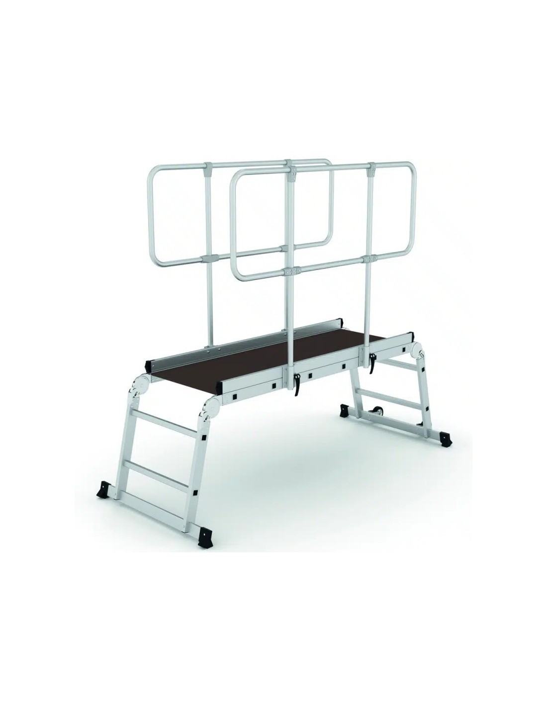 Plataforma profesional fabricada en aluminio con barandilla y 2 peldaños, le permitirá regular su altura. Esta plataforma profesional es muy fácil de transportar y almacenar gracias a su sistema de plegado. Tiene una inclinación de subida de 76º. Perfecta para trabajar dos operarios simultáneamente.