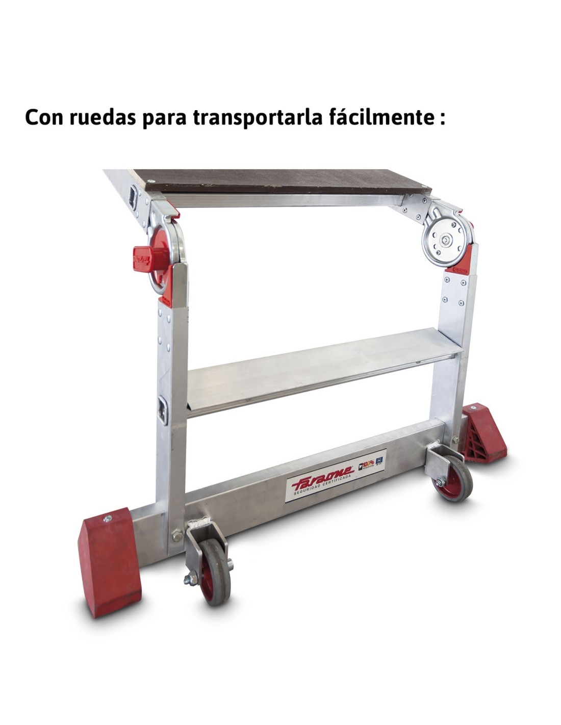 Plataforma profesional plegable fabricada en aluminio y con ruedas para facilitar su transporte de 2 peldaños. Esta plataforma plegable consta de una amplia área de trabajo en madera impermeable que facilitará aquellas tareas que requieran de un poco más de altura en sus labores (por ejemplo, es perfecta para tareas de mantenimiento en interior de viviendas o en industrias y maquinaria).