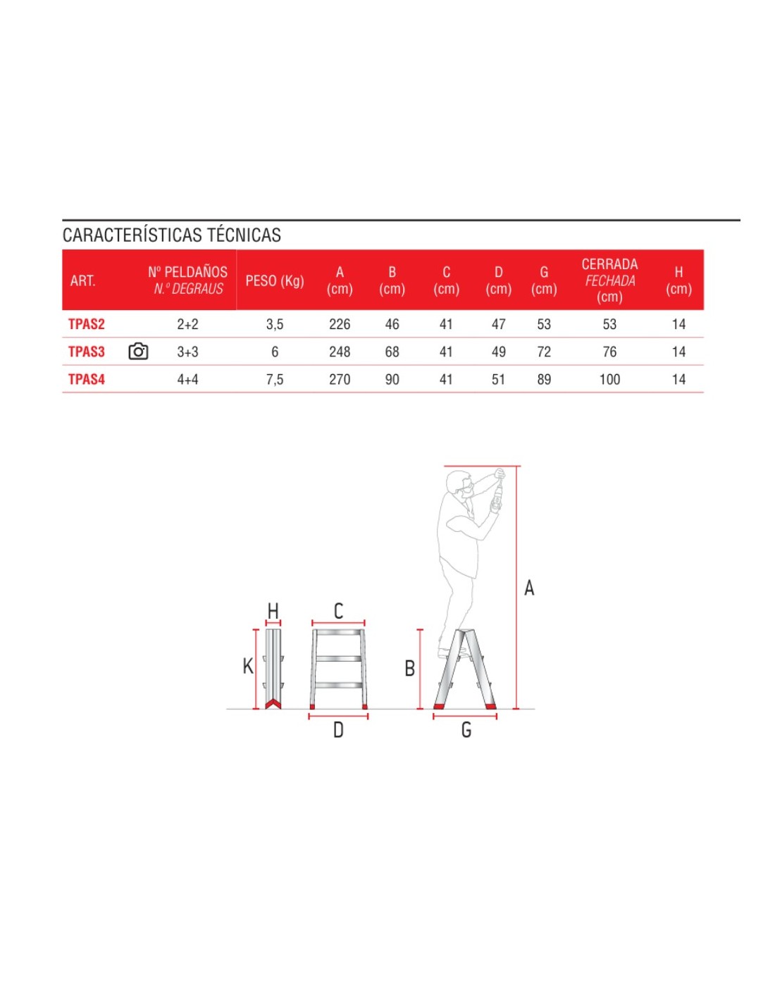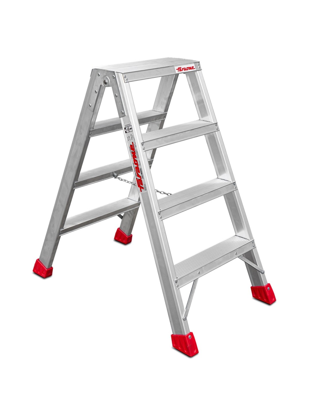 Taburete de aluminio TPAS4 de doble subida y 4+4 peldaños. Este taburete de aluminio cuenta con unas bisagras fuertes en ambos tramos de subida. Además, para mayor seguridad, también cuenta con un sistema de anti cierre.
