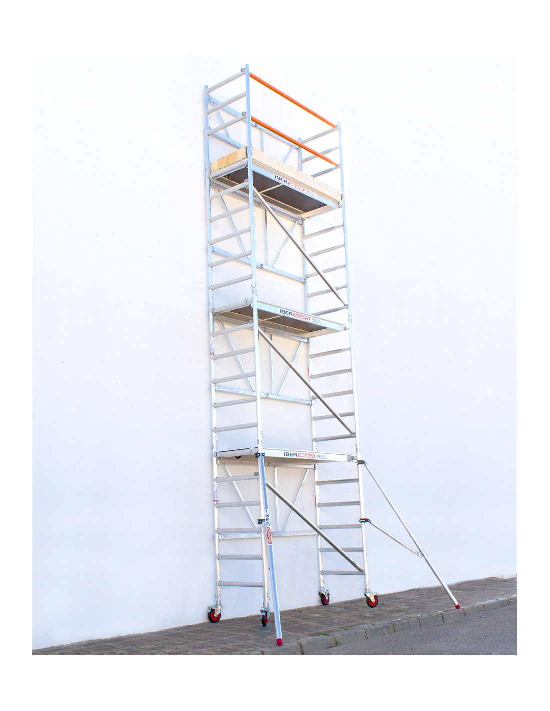 Andaime dobrável em alumínio de 75x190 e 7,50 metros de altura de trabalho com estabilizadores e rodapés em madeira, de grande qualidade e versatilidade, pois pode ser utilizado em todos os tipos de obras. Fácil de manusear e de montar, pode até movê-lo sem ter de o desmontar.