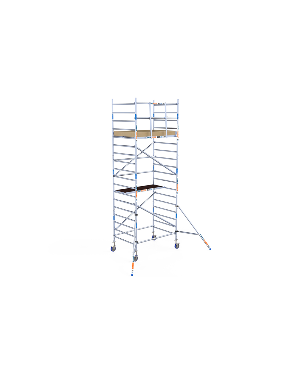 Na compra do andaime tipo torre móvel 135x190x620 metros altura de trabalho da linha ECO LINE da ASC você está adquirindo um dos andaimes móveis de alumínio mais seguros do mercado graças ao seu corrimão, que você pode montar antes mesmo de acessar a plataforma de trabalho, evitando assim o risco de acidentes. Proteja o seu trabalho em altura graças a esta torre de andaime móvel 100% homologada e em conformidade com as normas europeias. Este modelo tem uma altura de trabalho de 6,20 metros, mas você pode estendê-la até 10,20 metros graças à sua natureza expansível.