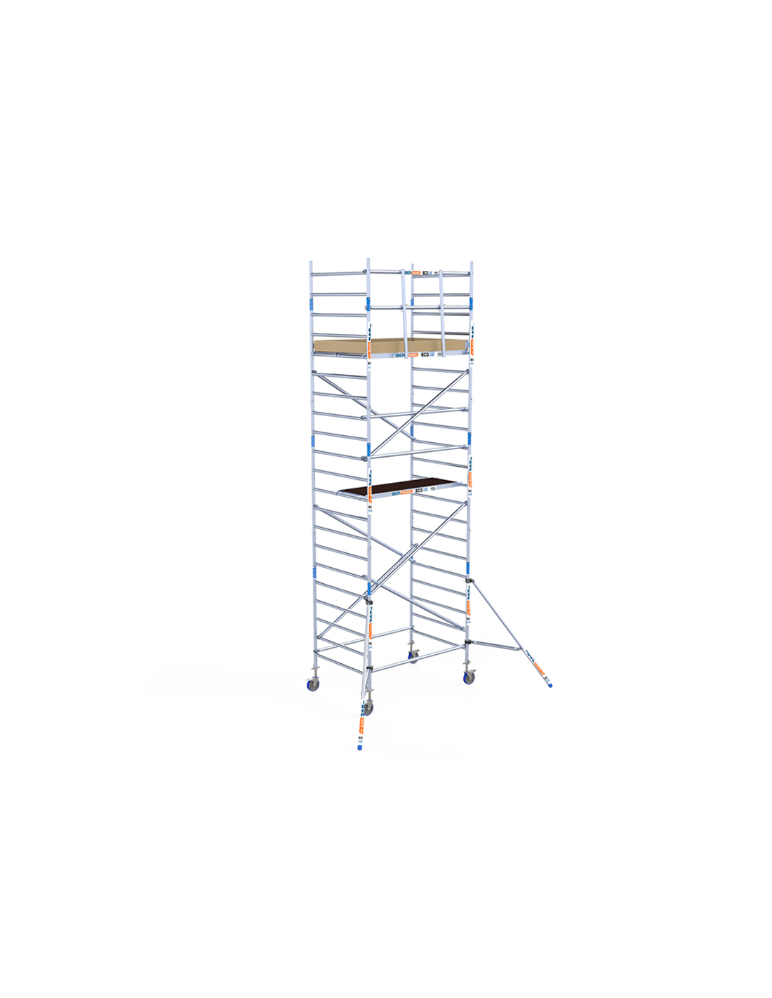 Na compra do andaime tipo torre móvel 135x190x720 metros altura de trabalho da linha ECO LINE da ASC você está adquirindo um dos andaimes móveis de alumínio mais seguros do mercado graças ao seu corrimão, que você pode montar antes mesmo de acessar a plataforma de trabalho, evitando assim o risco de acidentes. Proteja o seu trabalho em altura graças a esta torre de andaime móvel 100% homologada e em conformidade com as normas europeias. Este modelo tem uma altura de trabalho de 7,20 metros, mas você pode estendê-la até 10,20 metros graças à sua natureza expansível.