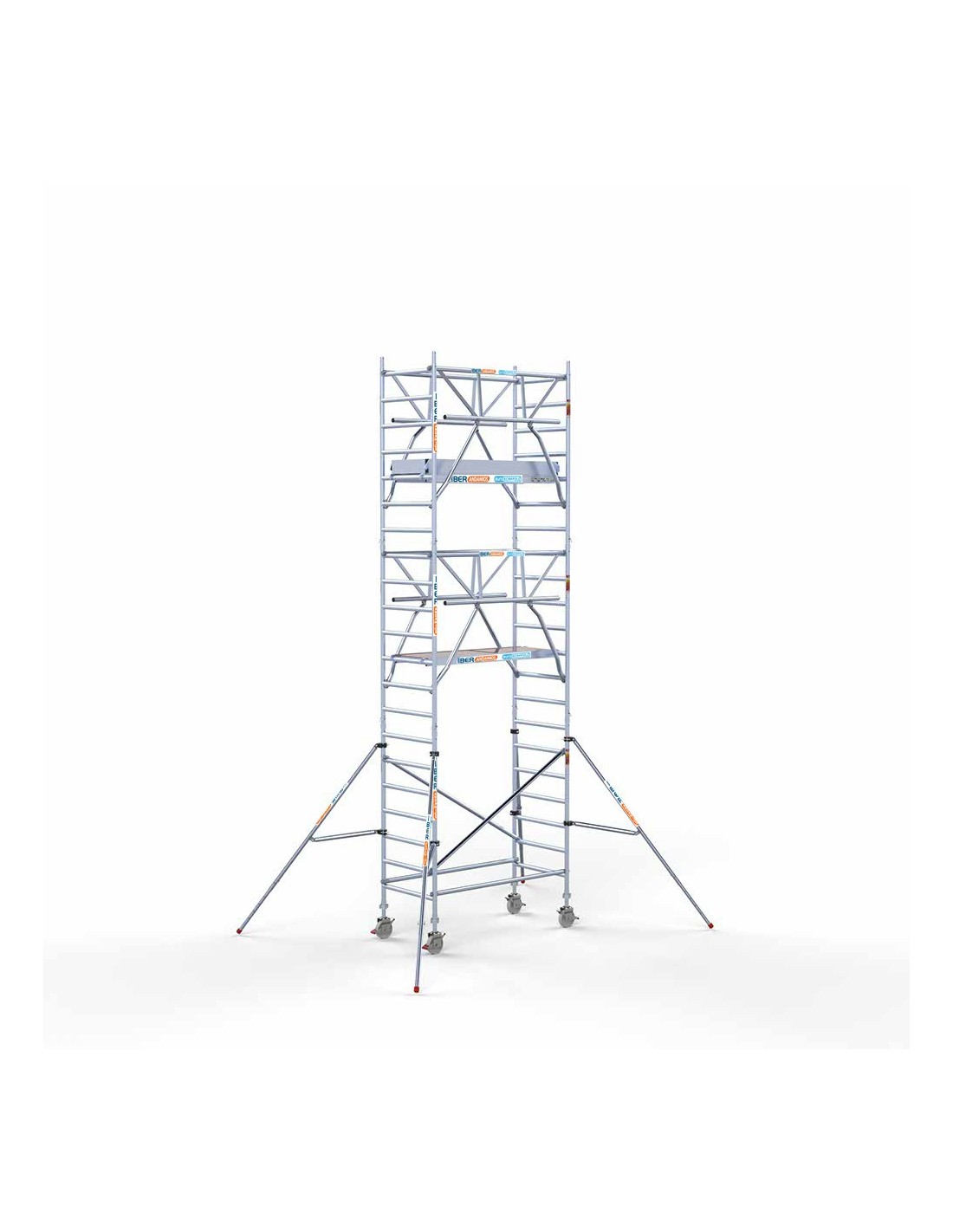 Na compra do andaime móvel tipo torre 90x190x720 metros de altura de trabalho da linha PRO DOBLE SAFE está a adquirir um dos andaimes móveis em alumínio mais seguros do mercado graças ao seu guarda-corpos SAFE INSTALL, que pode montar ainda antes de aceder à plataforma de trabalho, evitando assim o risco de acidentes. Proteja o seu trabalho em altura graças a esta torre de andaime móvel 100% homologada e em conformidade com as normas europeias. Este modelo tem uma altura de trabalho de 7,20 metros, mas pode estendê-la até 10,20 metros graças à sua natureza expansível.