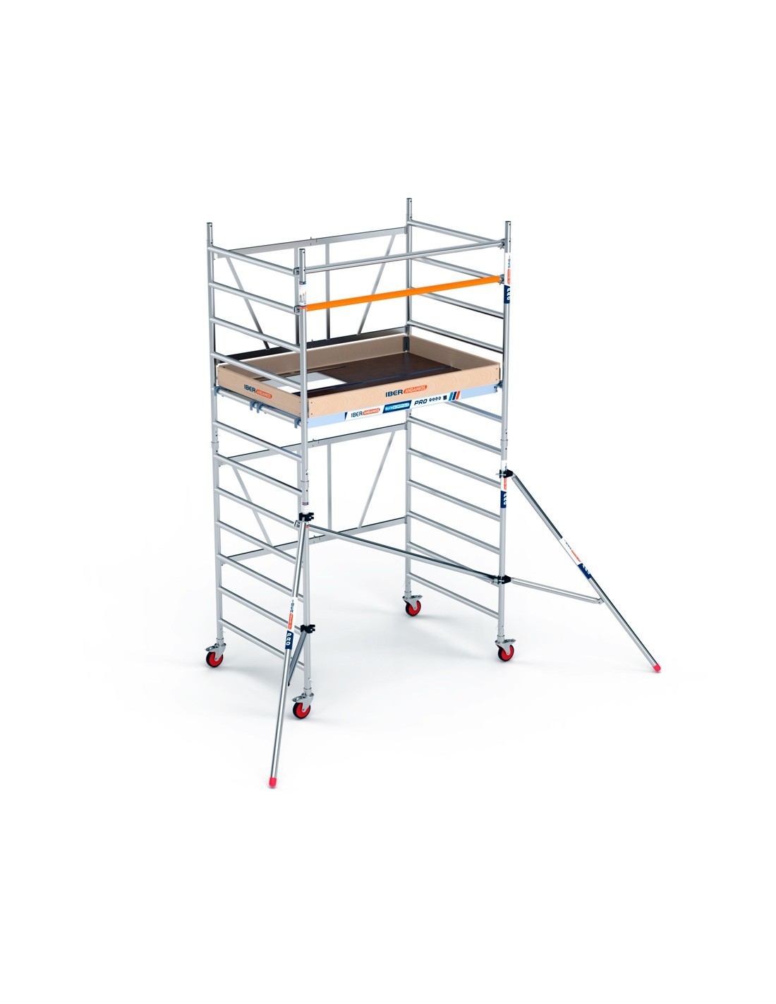 Andaime dobrável em alumínio com 135x190 e 4,70 metros de altura de trabalho com e sem escotilhas, estabilizadores e rodapés em madeira, de grande qualidade e versatilidade, pois pode ser utilizado em todo o tipo de obras. Fácil de manusear e de montar, pode até movê-lo sem ter de o desmontar. Andaime dobrável concebido para uso profissional, pronto em apenas 5 minutos.