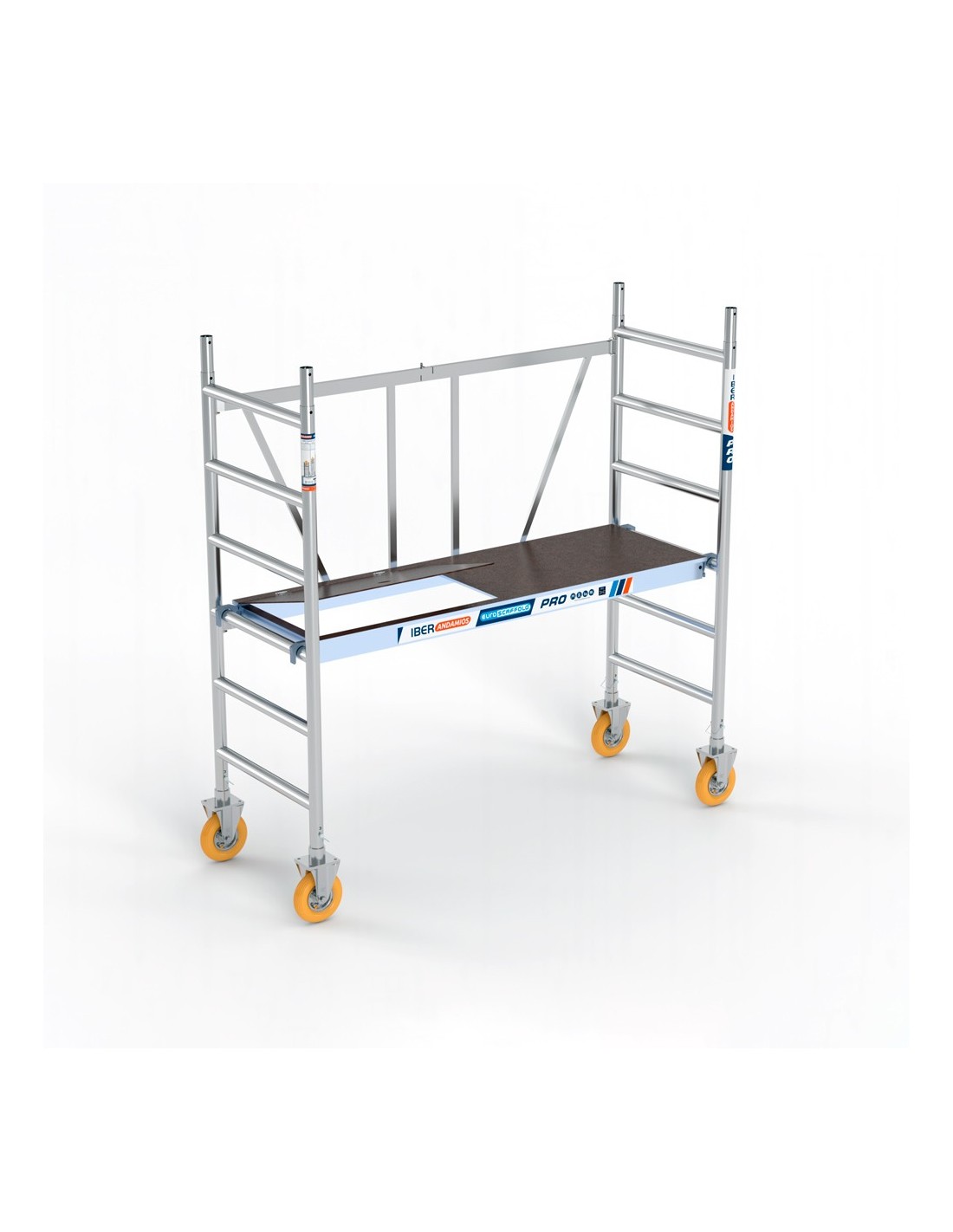 Andaime dobrável em alumínio 75x190 com altura de trabalho de 3 metros com portinhola e com rodas em borracha de 200mm com fuso e carga até 500kg. Um modelo de alta qualidade pensado para profissionais graças à sua resistência e versatilidade. Foi especialmente concebido para trabalhos de interiores, graças ao seu tamanho e aspecto compacto, que lhe permitirá transportá-lo para onde quiser sem ter de o desmontar.