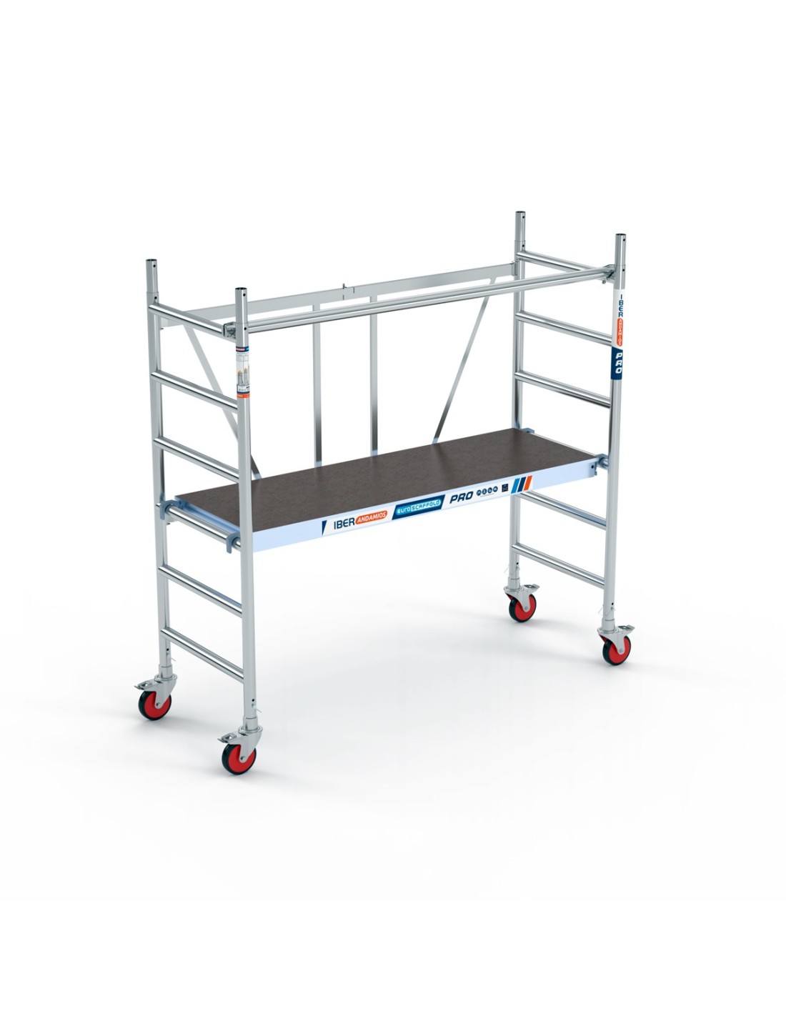 Andaime dobrável em alumínio 75x190 com altura de trabalho de 3 metros sem portinhola e com barra extra. Um modelo de alta qualidade pensado para profissionais graças à sua resistência e versatilidade. Foi especialmente concebido para trabalhos de interiores, graças ao seu tamanho e aspecto compacto, que lhe permitirá transportá-lo para onde quiser sem ter de o desmontar.