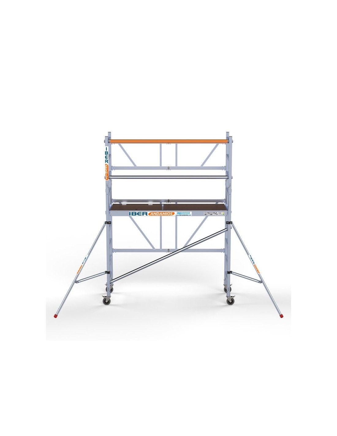 Andamio de aluminio plegable 90x190 y 3,85 metros altura de trabajo con estabilizadores y plataforma complementaria de 30 cm, de gran calidad y polivalencia, ya que puede usarse en todo tipo de obras. Fácil de manejar y montar, puede incluso desplazarlo sin necesidad de desmontarlo. Gracias a su plataforma complementaria de 30 cm, puedes combinar la composición de tu andamio plegable en distintas posiciones, ya sea para aumentar el ancho de la plataforma de trabajo o para utilizarla como lugar para colocar herramientas u otros objetos.