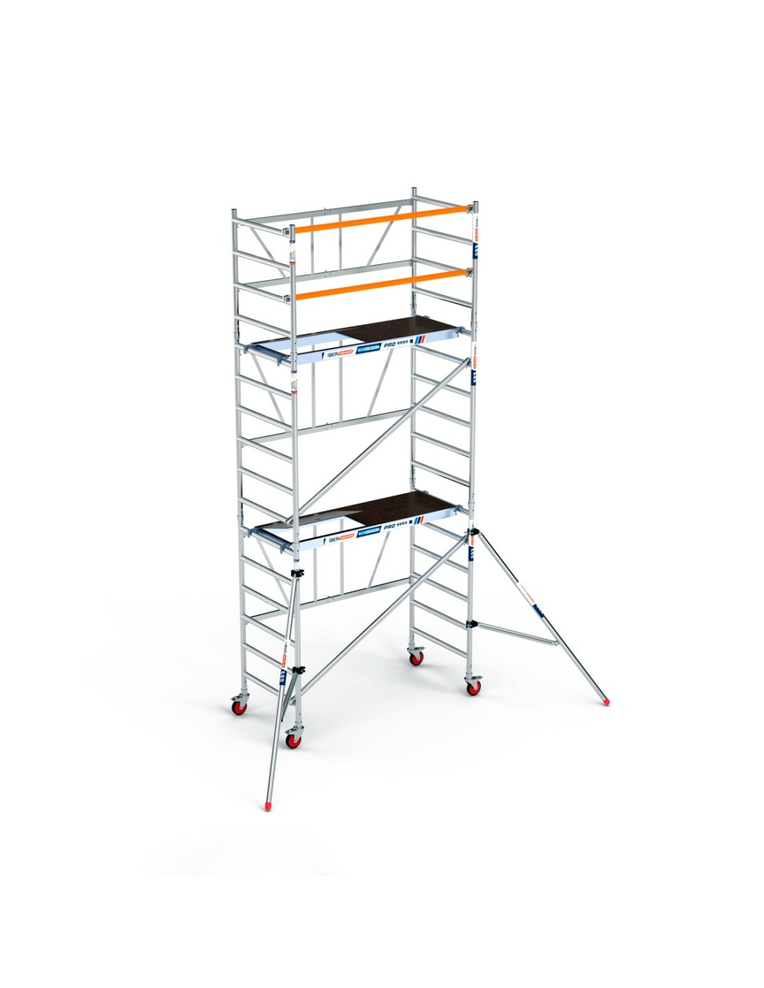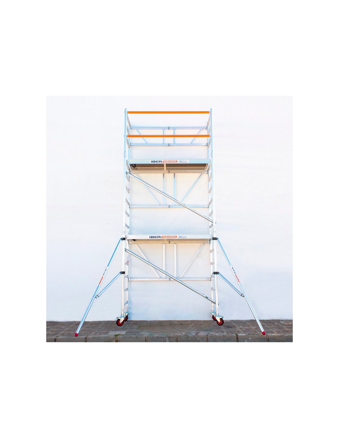 Andaime dobrável em alumínio 90x190 e 5,70 metros de altura de trabalho com estabilizadores, de grande qualidade e versatilidade, pois pode ser utilizado em todo o tipo de obras. Fácil de manusear e de montar, pode até movê-lo sem ter de o desmontar. Andaime dobrável concebido para uso profissional, pronto em apenas 6 minutos. Este andaime dobrável pode ser ampliado para atingir uma altura máxima de trabalho de 7,50 metros.