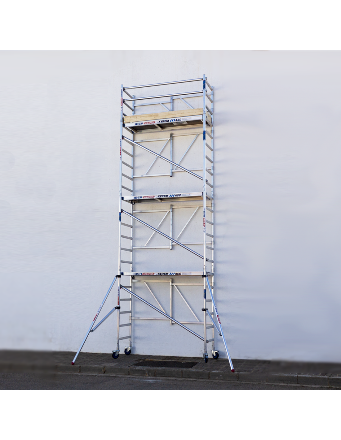 O andaimes dobrável de alumínio 75x190 com 7,50m de altura de trabalho com estabilizadores e rodapés de madeira da linha XTREM, adapta-se a qualquer que seja a sua necessidade de trabalho em altura. Este andaime dobrável de alumínio destaca-se pela resistência do seu material, pela sua facilidade de montagem e pela extraordinária qualidade das suas peças e componentes. Este andaime dobrável em alumínio está 100% homologado e cumpre as normas europeias de segurança e de homologação. Este modelo em particular tem uma altura de trabalho de 7,50 m.