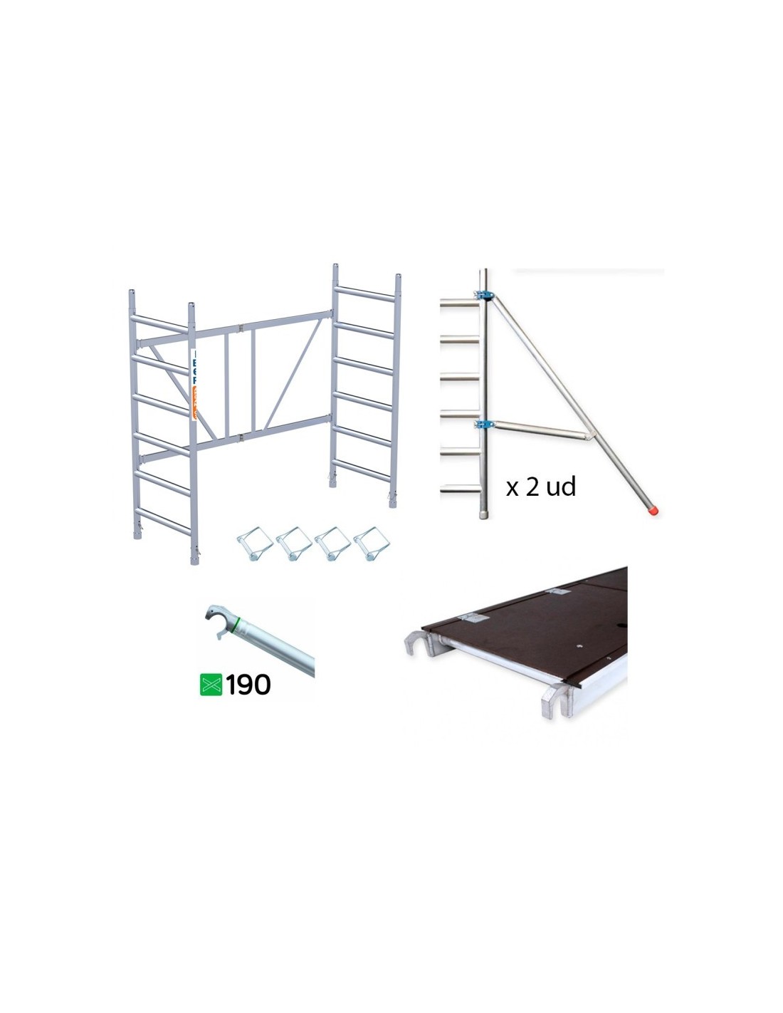 Módulo extensível de 4,70 metros a 6,50 metros para andaimes dobráveis com escotilha. Fácil de montar e desmontar, bem como de armazenar e transportar. Expansível até 7,50 metros de altura de trabalho. As suas dimensões são 75 cm de largura por 190 cm de comprimento.