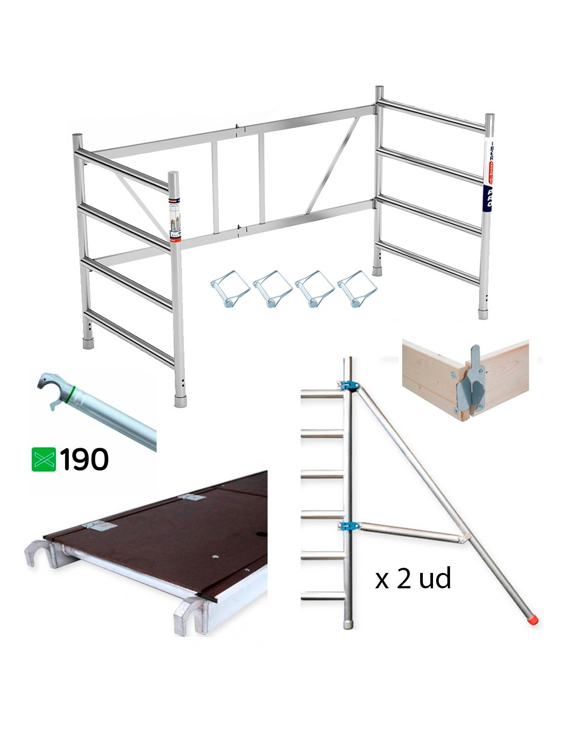 Módulo extensível de 4,70 metros a 5,70 metros para andaimes dobráveis com escotilha. Fácil de montar e desmontar, bem como de armazenar e transportar. Expansível até 7,50 metros de altura de trabalho. As suas dimensões são 90 cm de largura por 190 cm de comprimento.