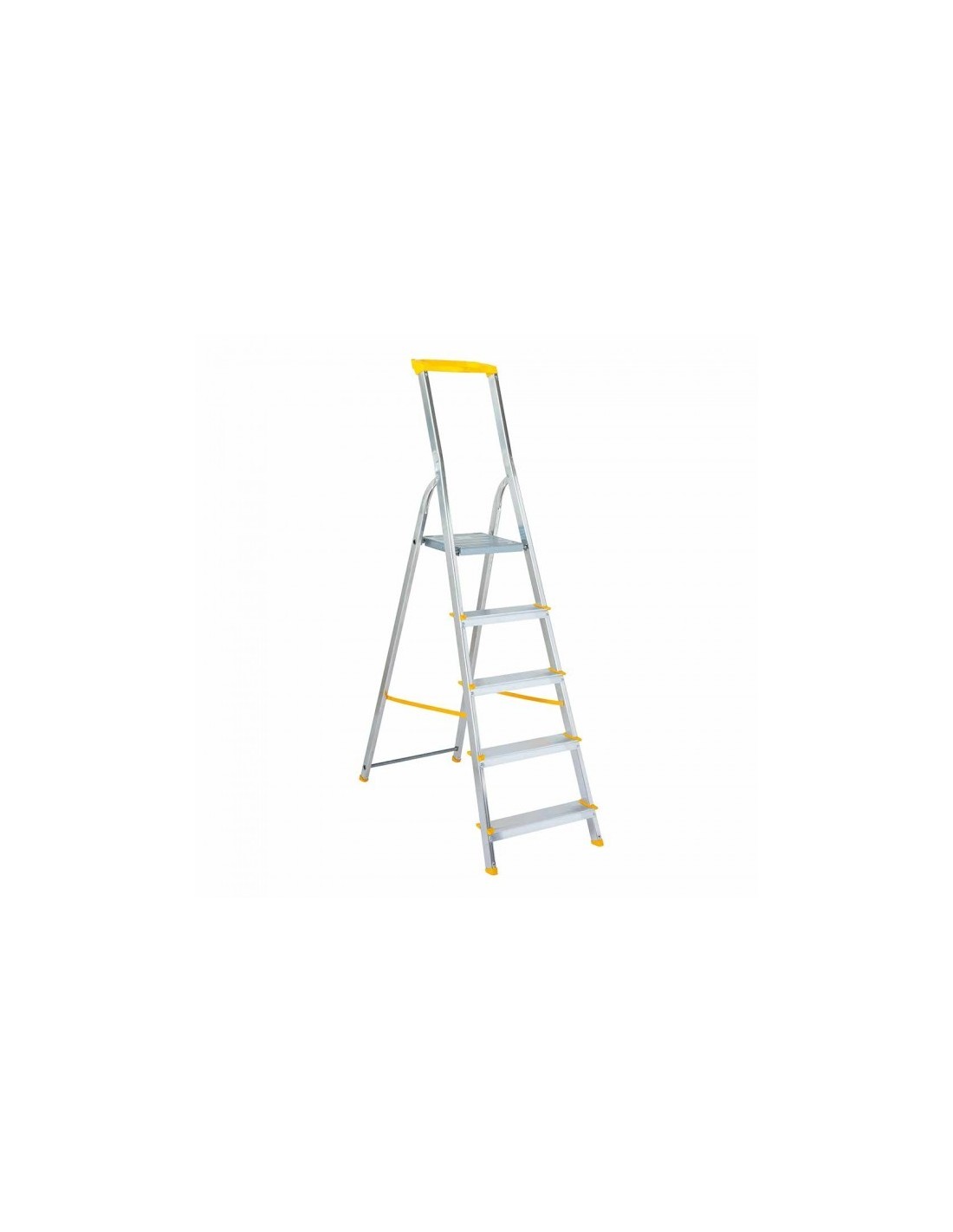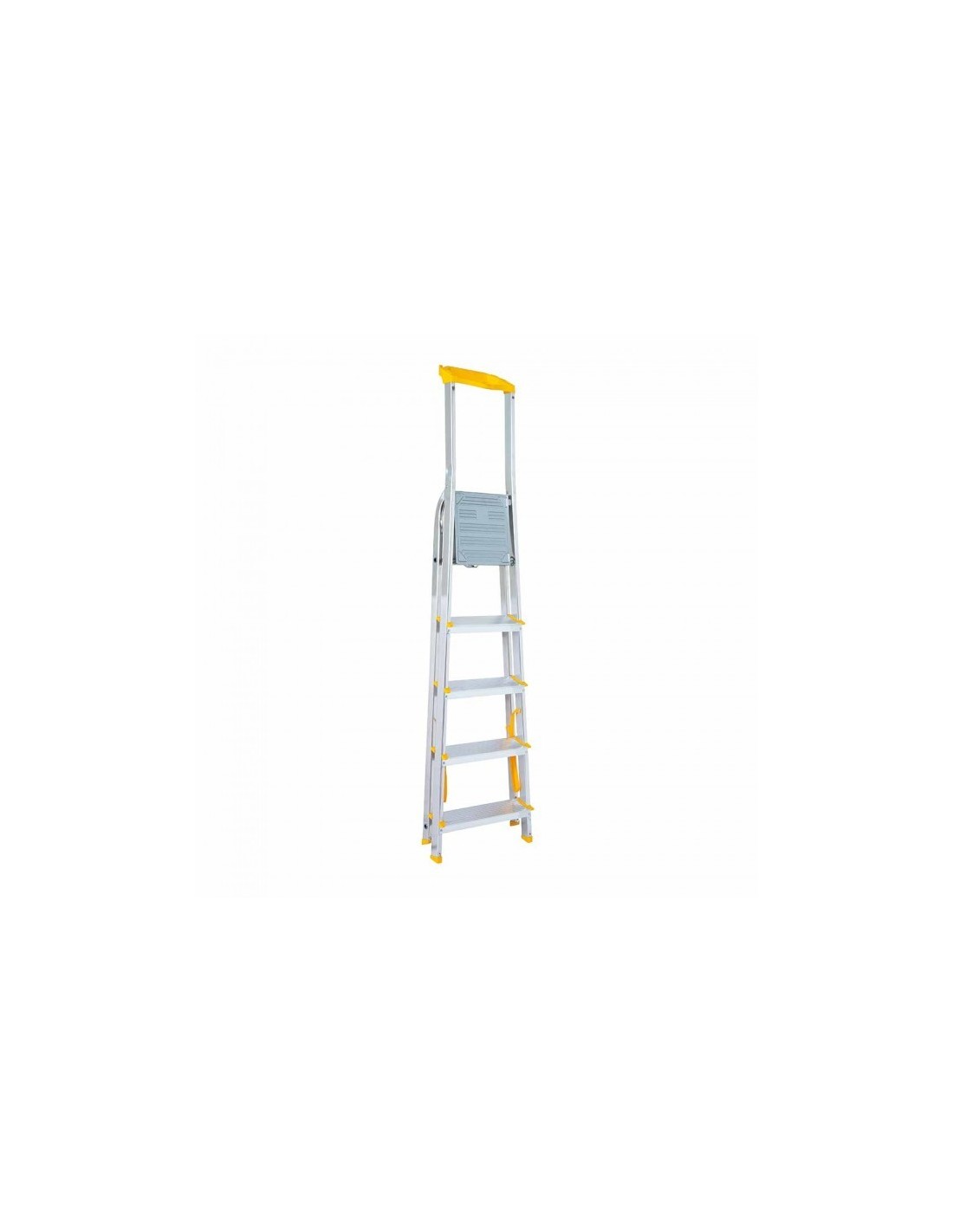 Escada doméstica de 1x5 degraus com tabuleiro de ferramentas. Esta escada DIY possui degraus e protetores de pernas antiderrapantes, garantindo a sua estabilidade. Tenha as suas ferramentas à mão graças à sua caixa de ferramentas.