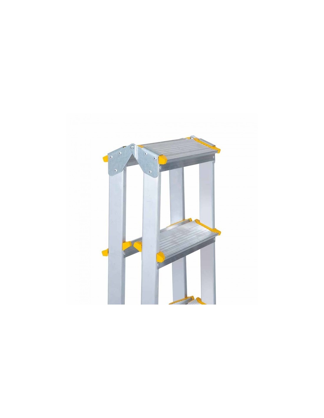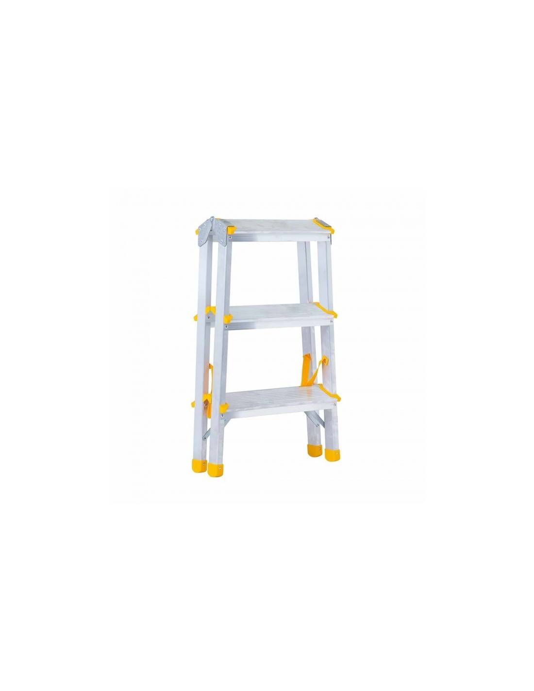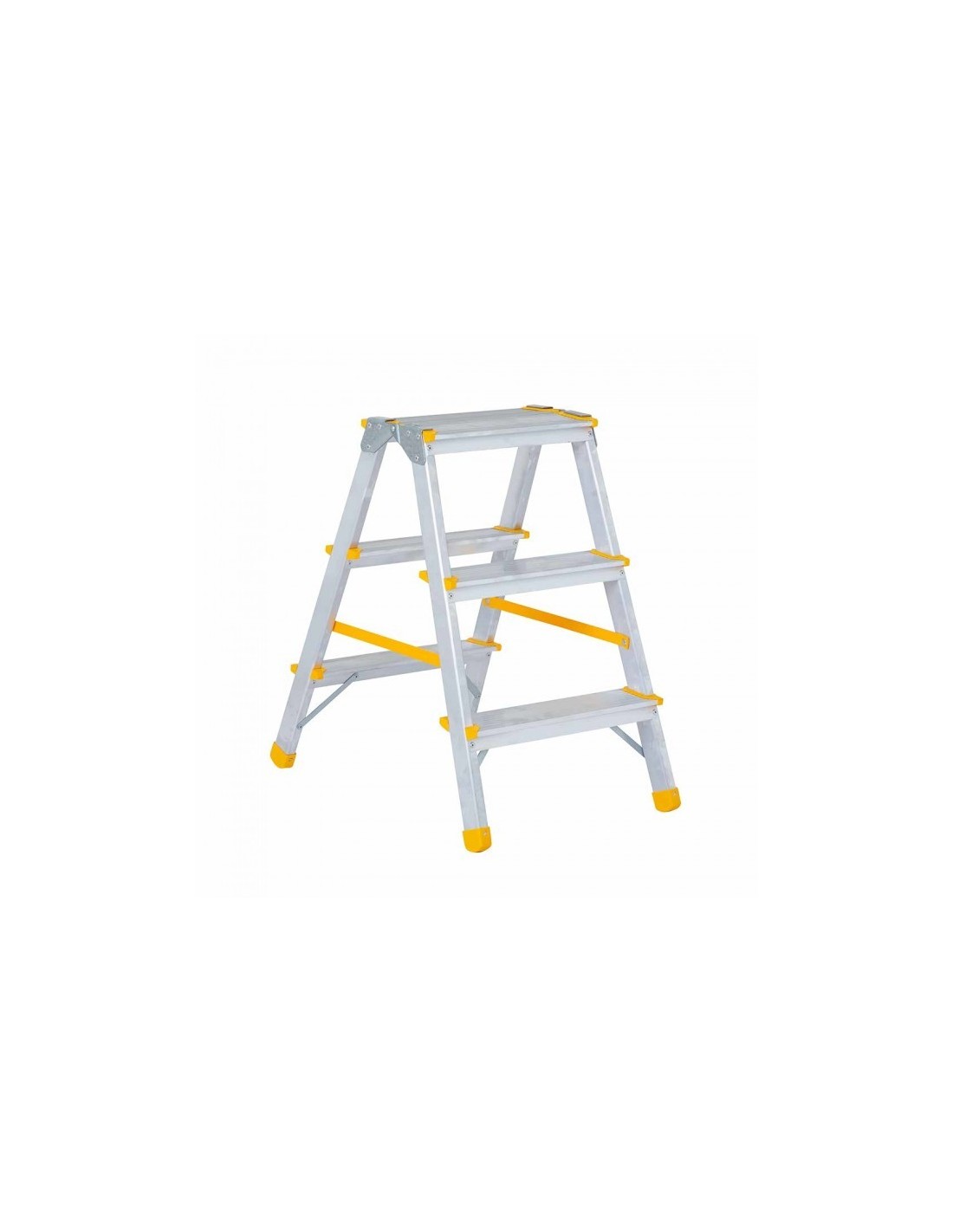 Escada doméstica dupla com degraus 2x3, com degraus antiderrapantes e fabricada em alumínio. Fácil de arrumar e a opção perfeita para pequenas tarefas domésticas que exigem um pouco mais de altura.