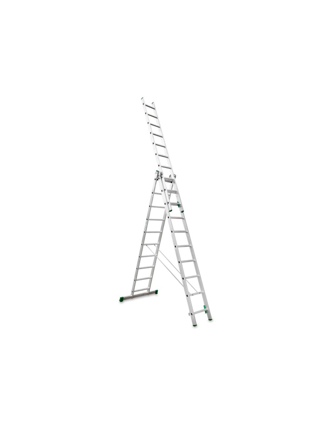 Escada doméstica multiusos ES-TRIPLE10 com três secções em alumínio e especialmente concebida para uso DIY. Pode usá-lo em até duas posições, tesoura e estendido na parede. É a escada perfeita para realizar trabalhos em superfícies irregulares.