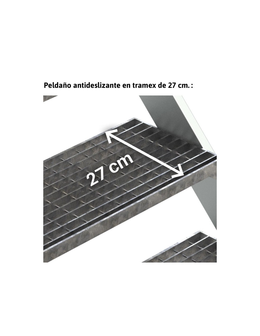 Escada fixa profissional em tramex para mezaninos e mezaninos com inclinação de 45º SG-T de 5 degrauss. Esta escada fixa é fabricada em alumínio, concebida para ancorar ao solo e aceder facilmente a mezaninos ou mezaninos industriais.