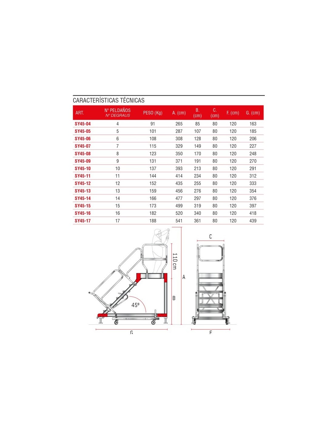 Escada profissional com plataforma de 9 degraus e rodas, disponível de 4 a 17 degraus dependendo das preferências (consulte o nosso catálogo). Fabricada em alumínio, esta escada profissional possui uma plataforma de trabalho de 80x100 cm e acesso através de uma escada inclinada 45º. Graças ao seu material, é leve e robusto ao mesmo tempo, permitindo um fácil transporte e uma estrutura robusta. Perfeito para uso profissional e industrial.