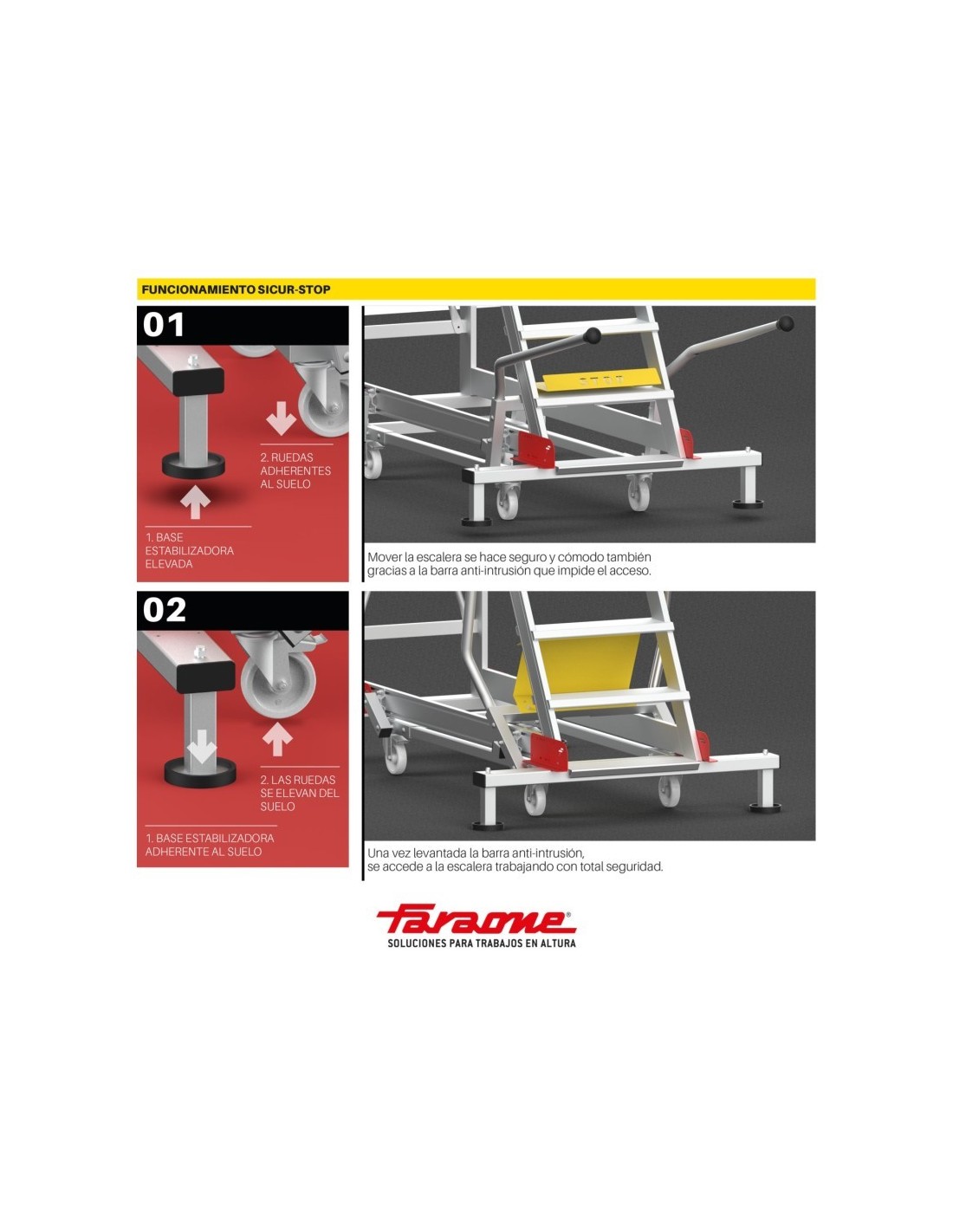 Escada profissional com plataforma de 7 degraus e rodas, disponível de 4 a 17 degraus consoante as preferências (ver catálogo). Fabricada em alumínio, esta escada profissional possui uma plataforma de trabalho de 60x100 cm e acesso através de uma escada inclinada 60º. Graças ao seu material, é leve e robusto ao mesmo tempo, permitindo um fácil transporte e uma estrutura robusta. Perfeito para uso profissional e industrial.