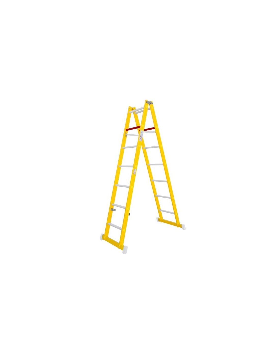 Escada profissional de fibra de dois degraus com 14 degraus. Este modelo também está disponível de 4 a 16 passos, dependendo das preferências, no nosso catálogo. Esta escada profissional de fibra dupla tipo tesoura cumpre a norma EN131 e permite uma abertura de 72º em cada troço.