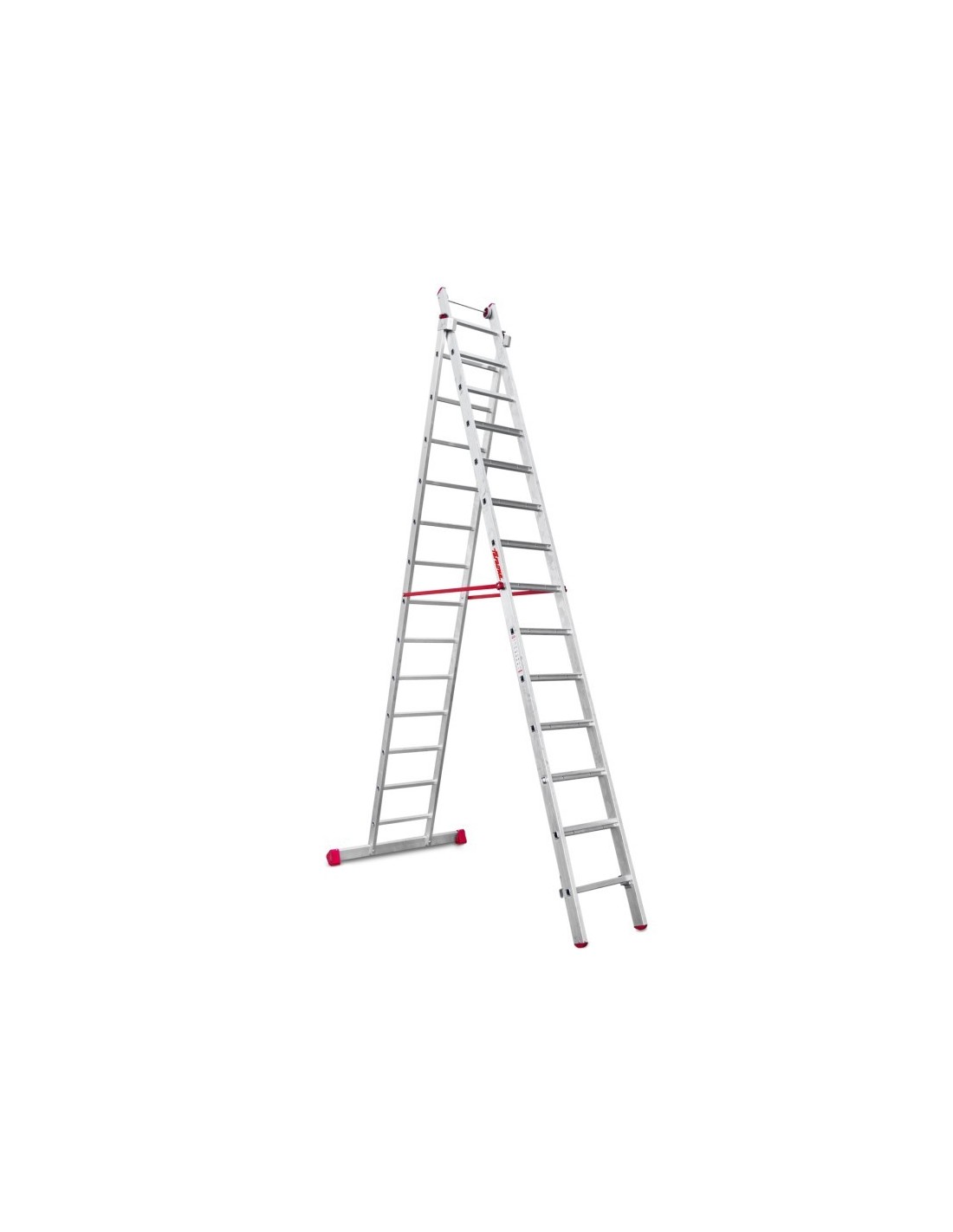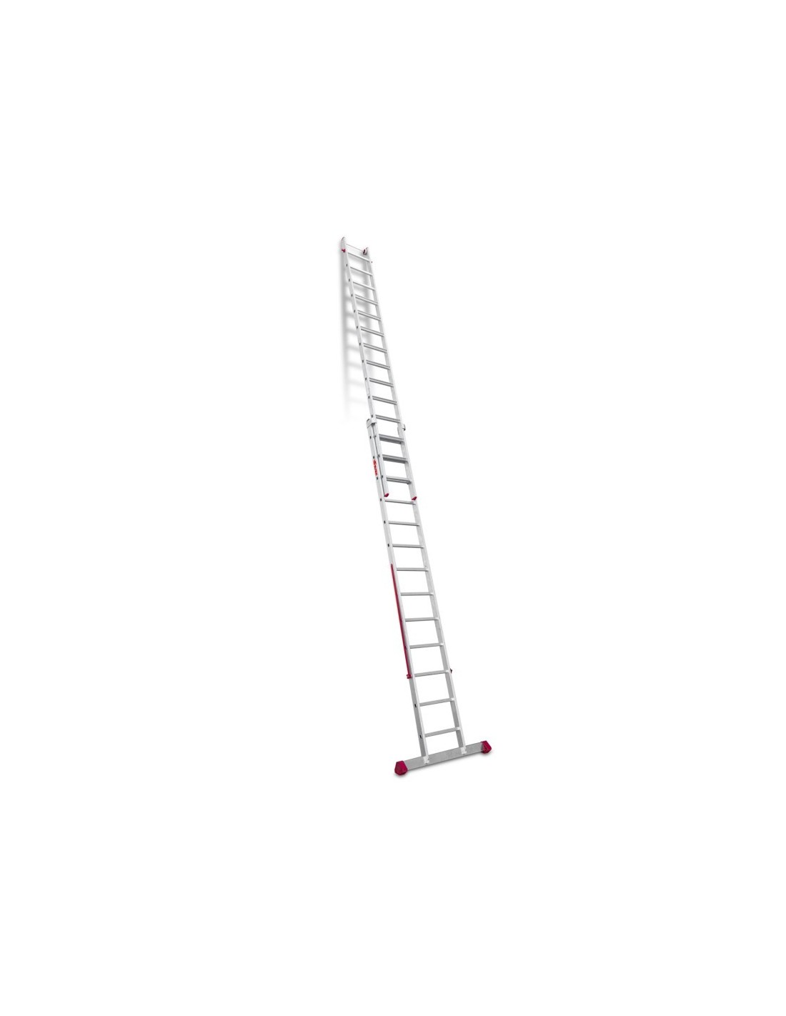 Escada profissional multiusos EN1400 com dois corpos e 14 degraus. Esta escada multiusos é feita de alumínio e as suas duas secções podem ser estendidas para que possa ser utilizada contra uma parede. Além disso, também pode ser utilizado em pisos irregulares, como passeios ou escadas, graças ao facto de poder ser utilizado em terrenos irregulares.