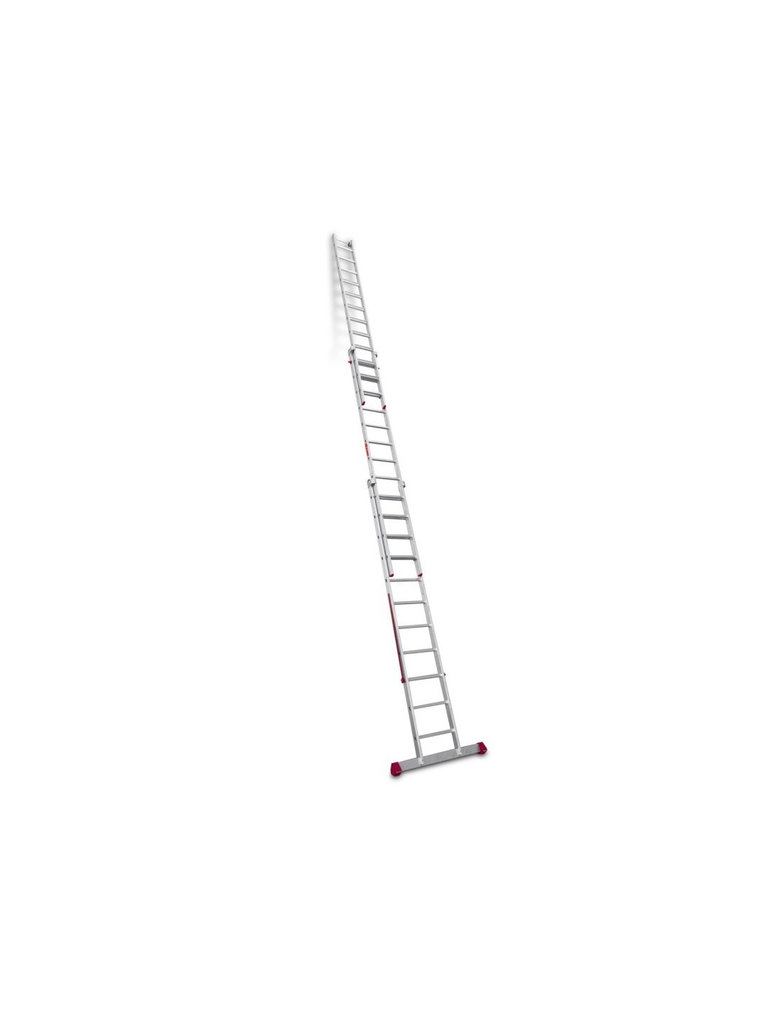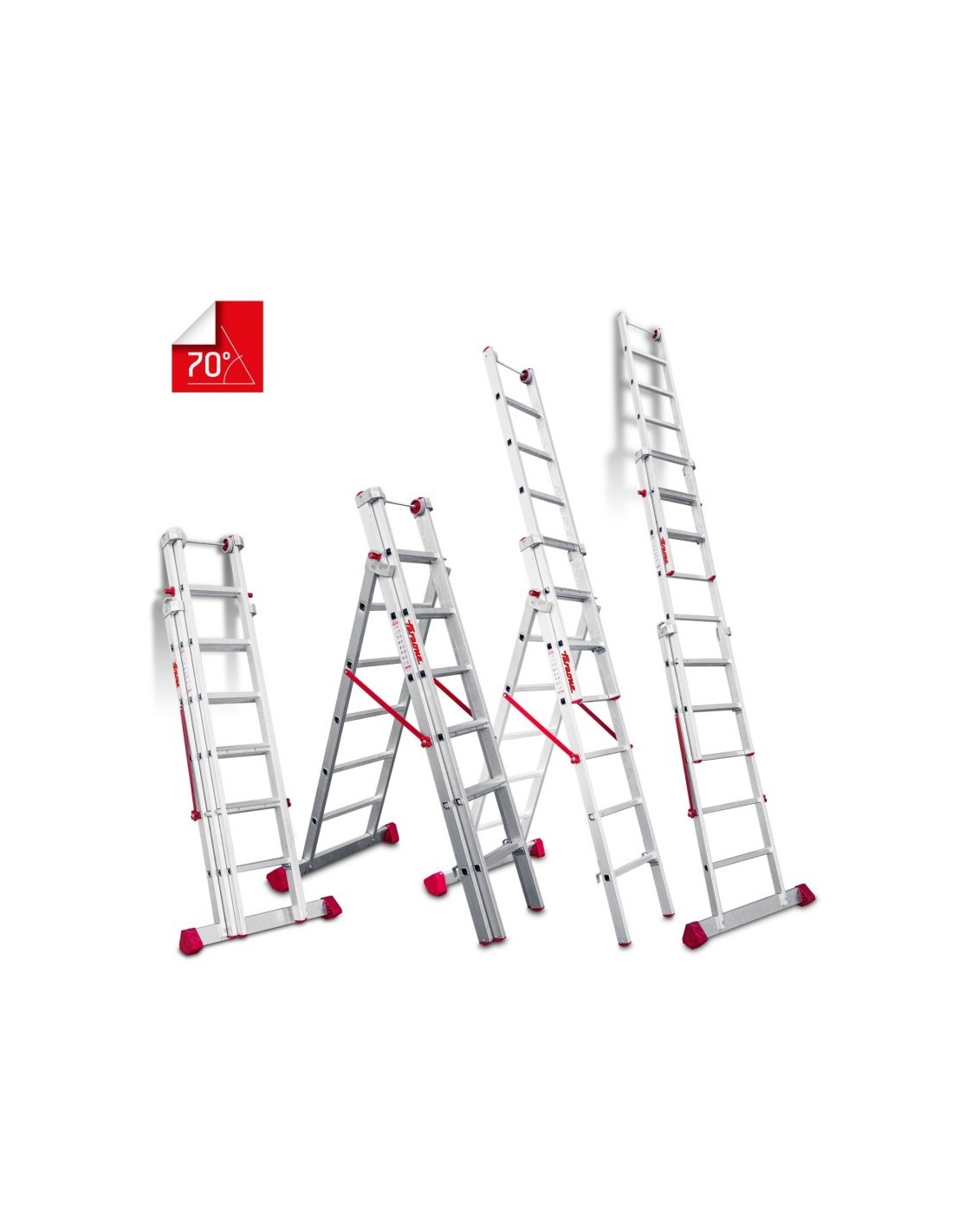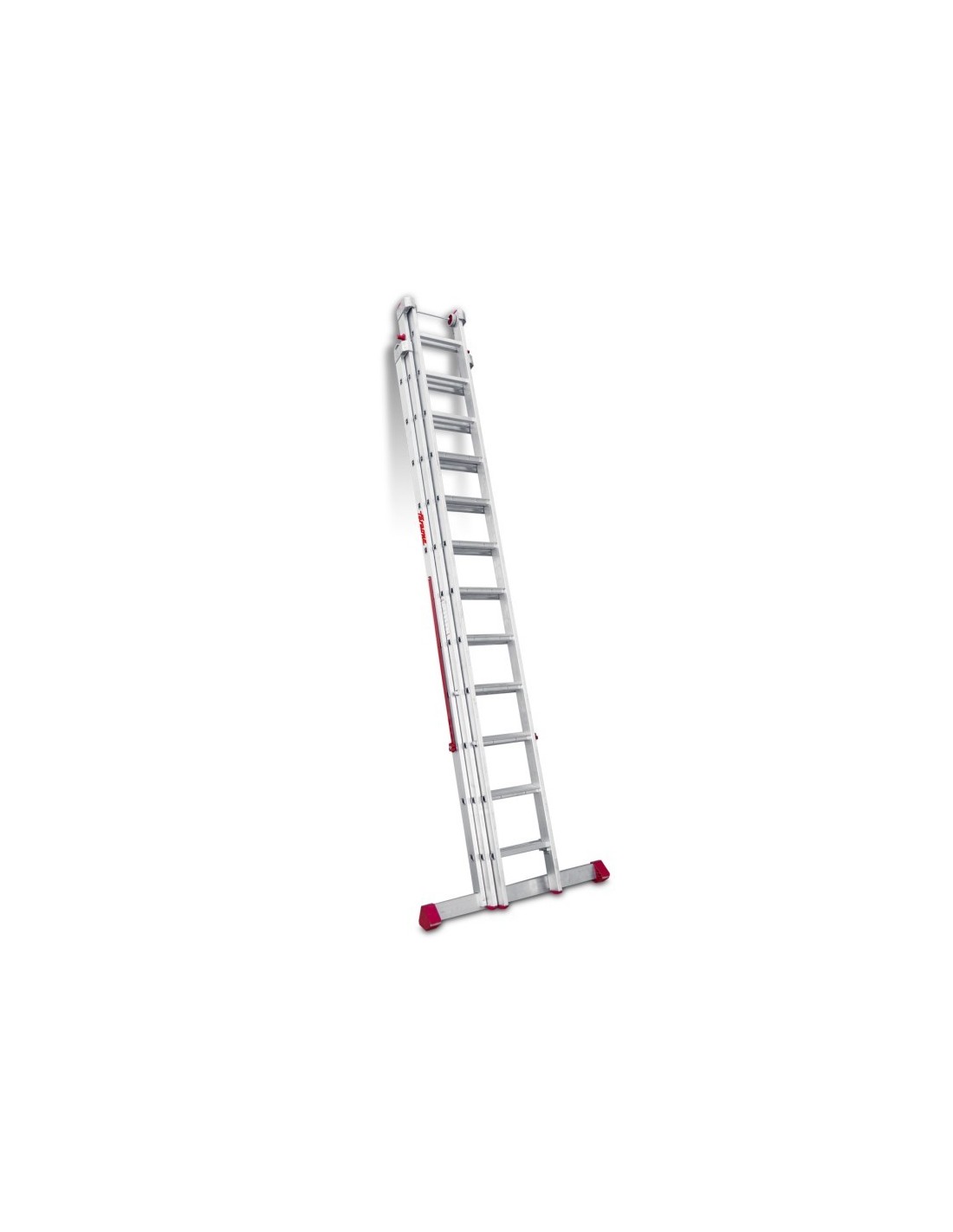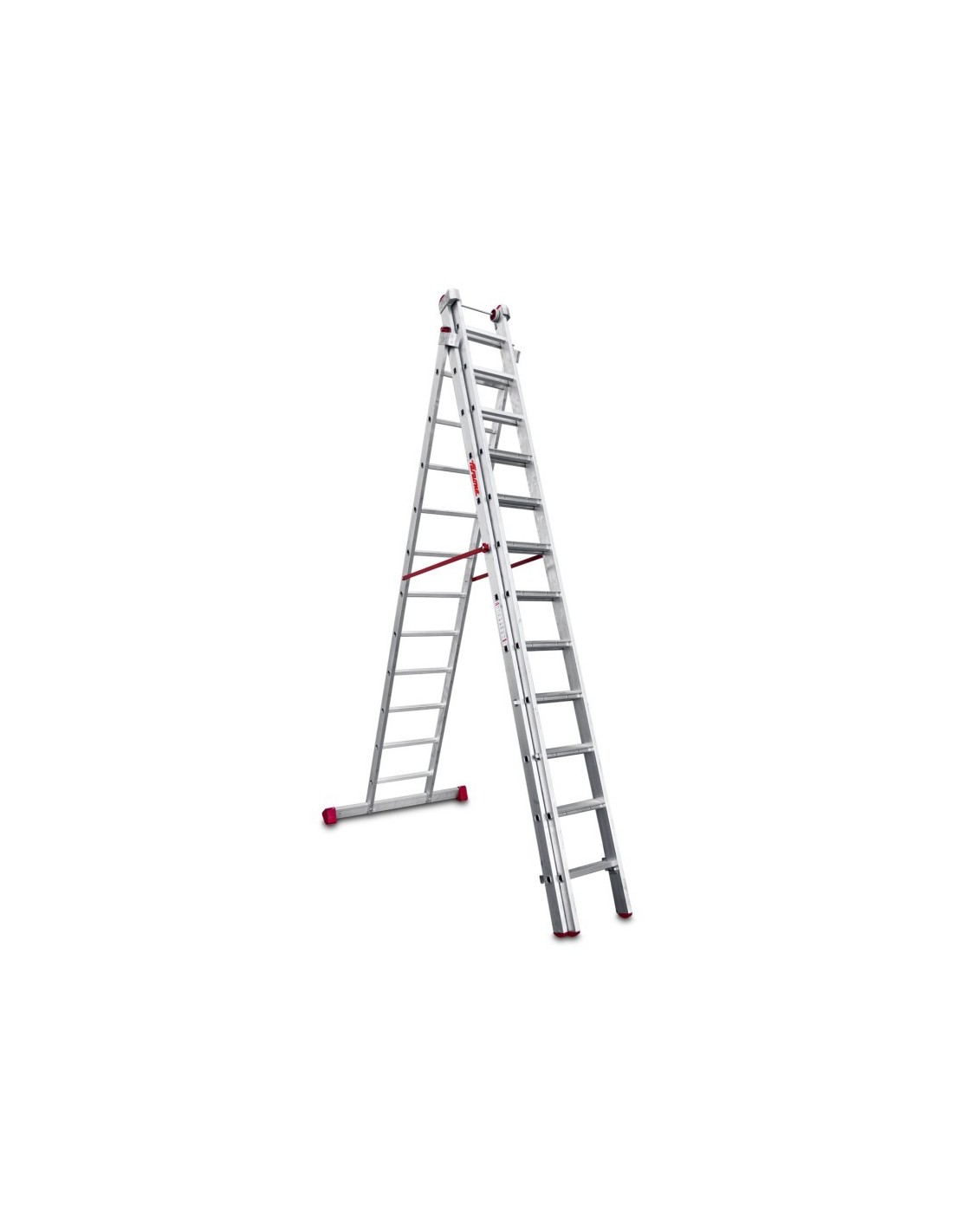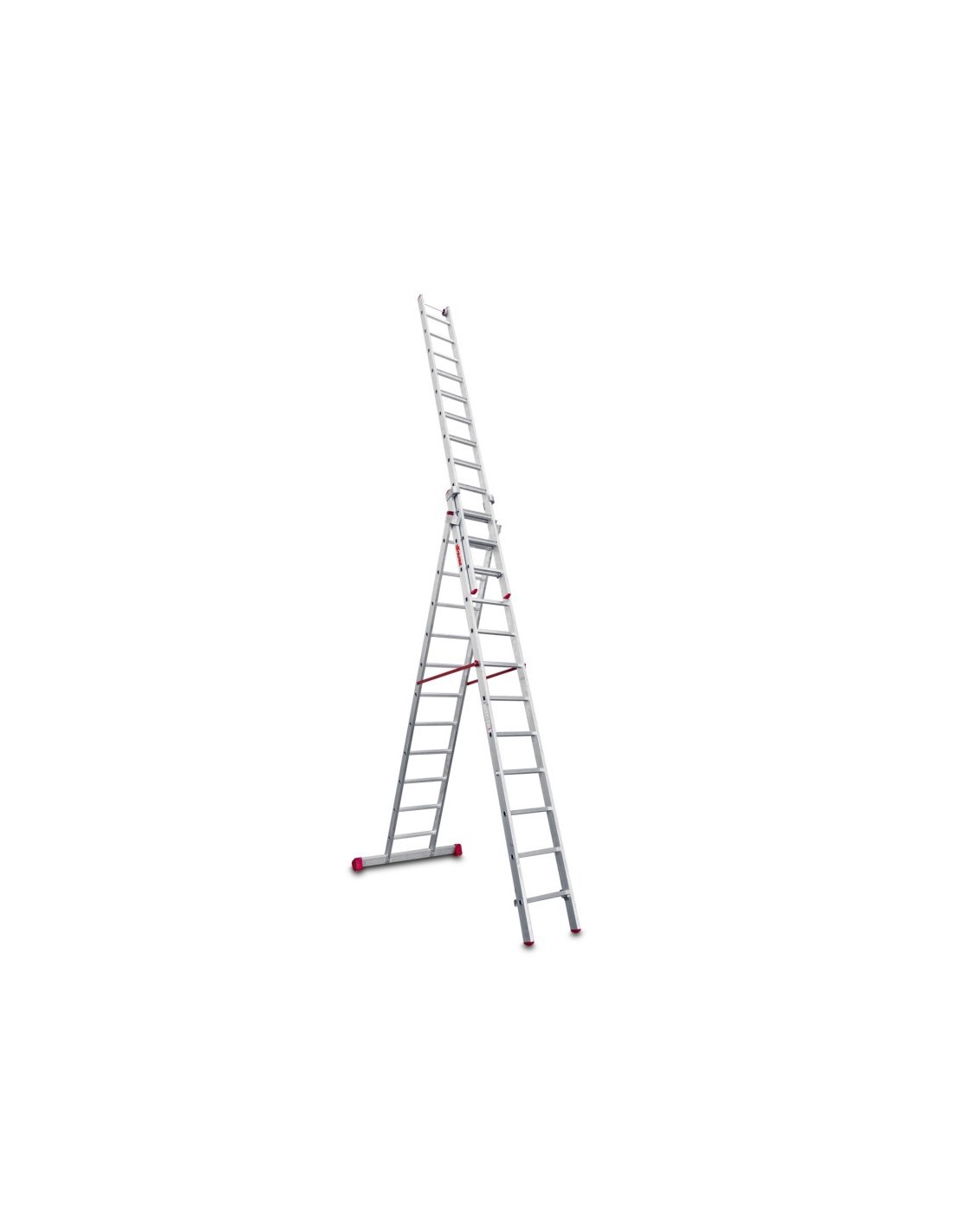 Escada profissional multiusos EN1500 com três corpos e 12 degraus. Esta escada multiusos é feita de alumínio e as suas duas secções podem ser estendidas para que possa ser utilizada contra uma parede. Além disso, também pode ser utilizado em pisos irregulares, como passeios ou escadas, graças ao facto de poder ser utilizado em terrenos irregulares.