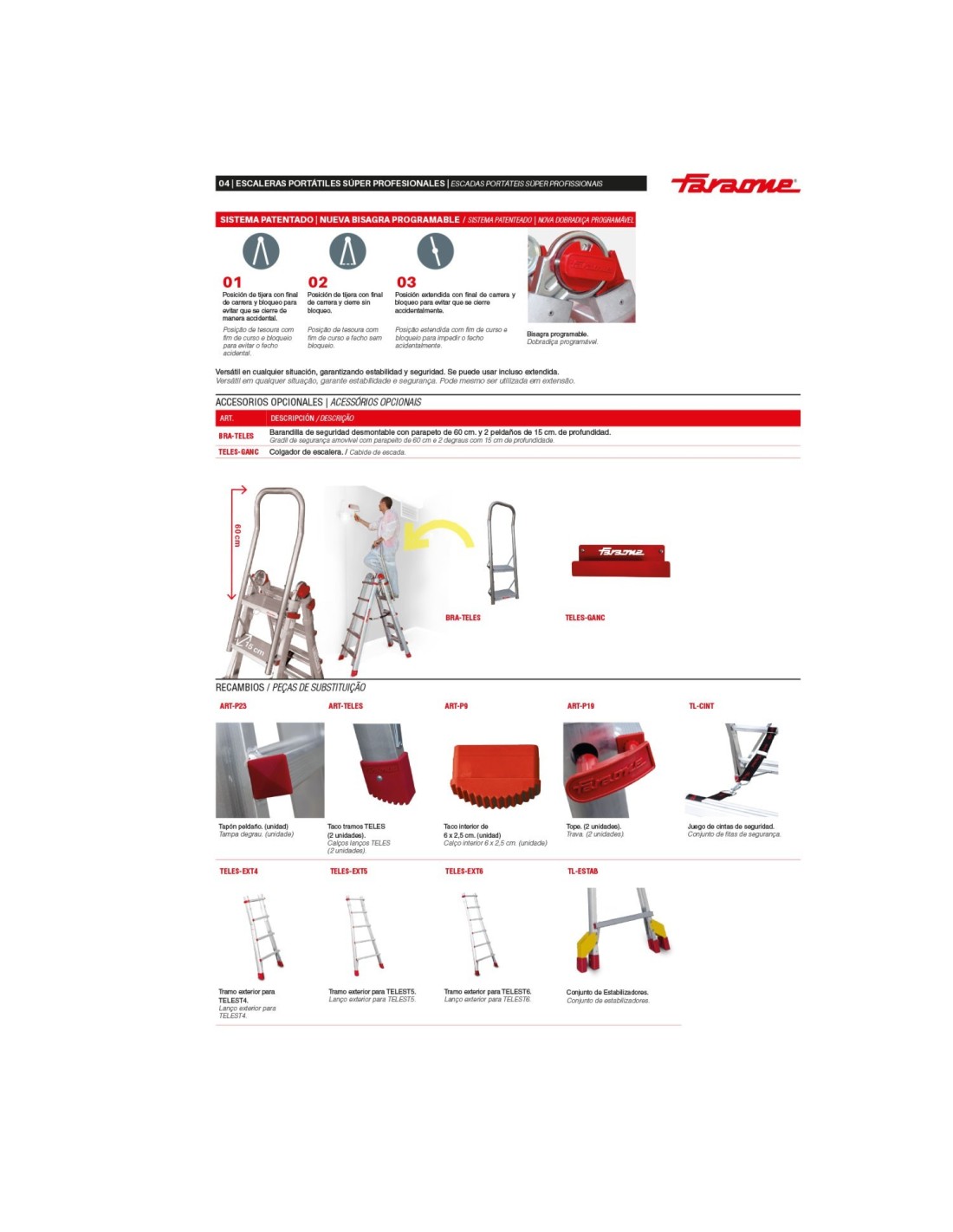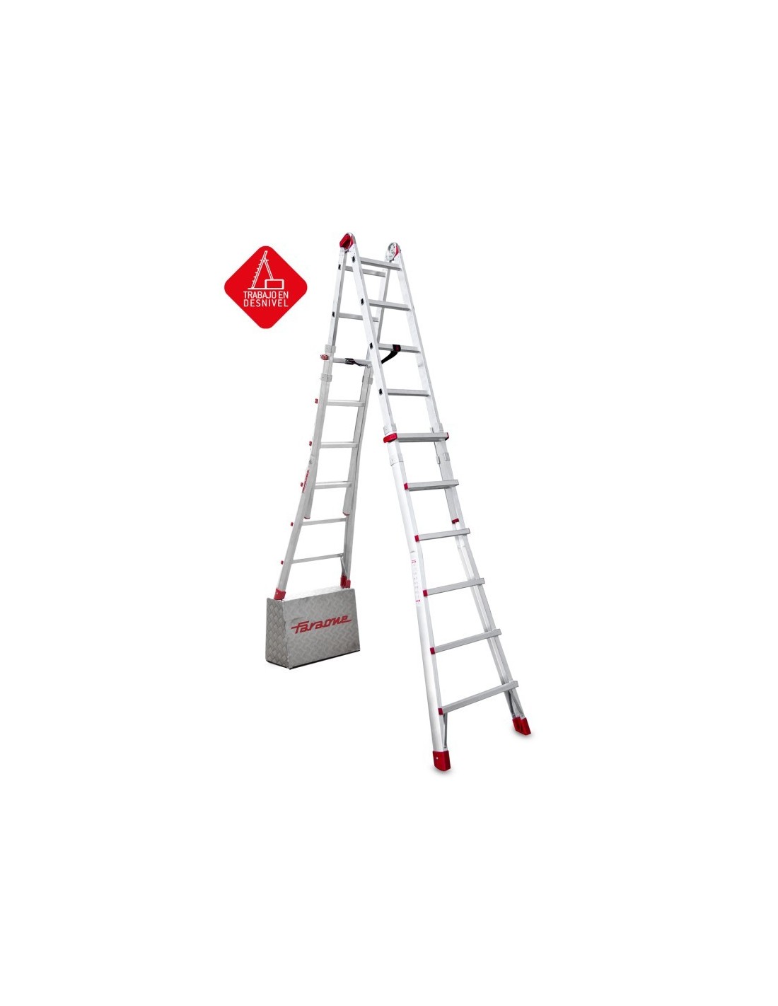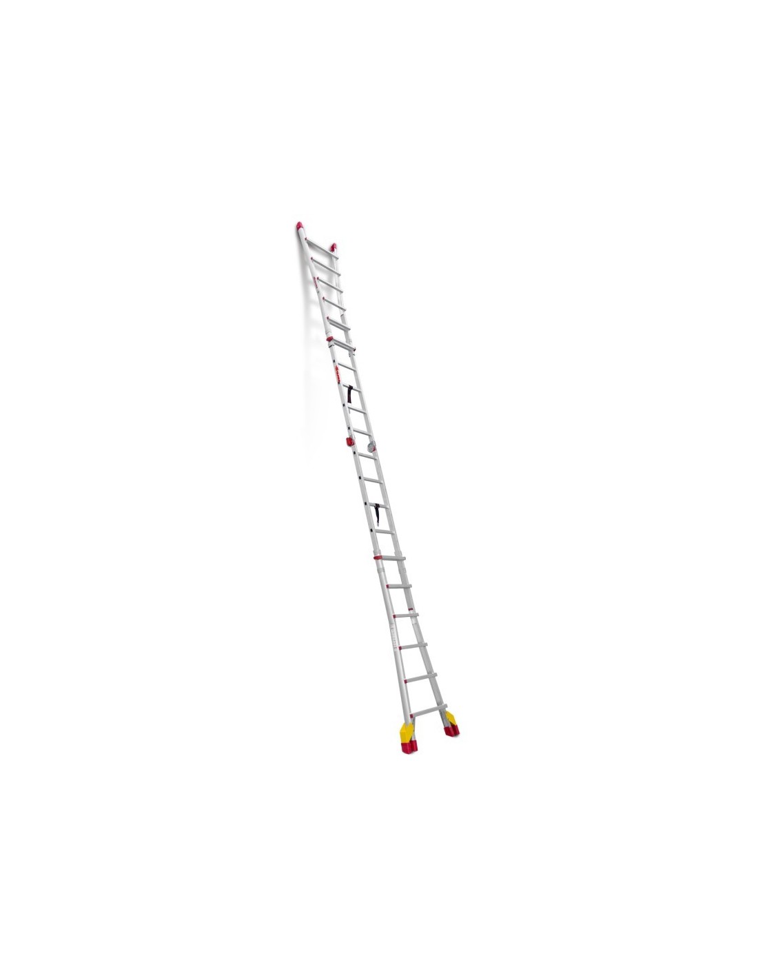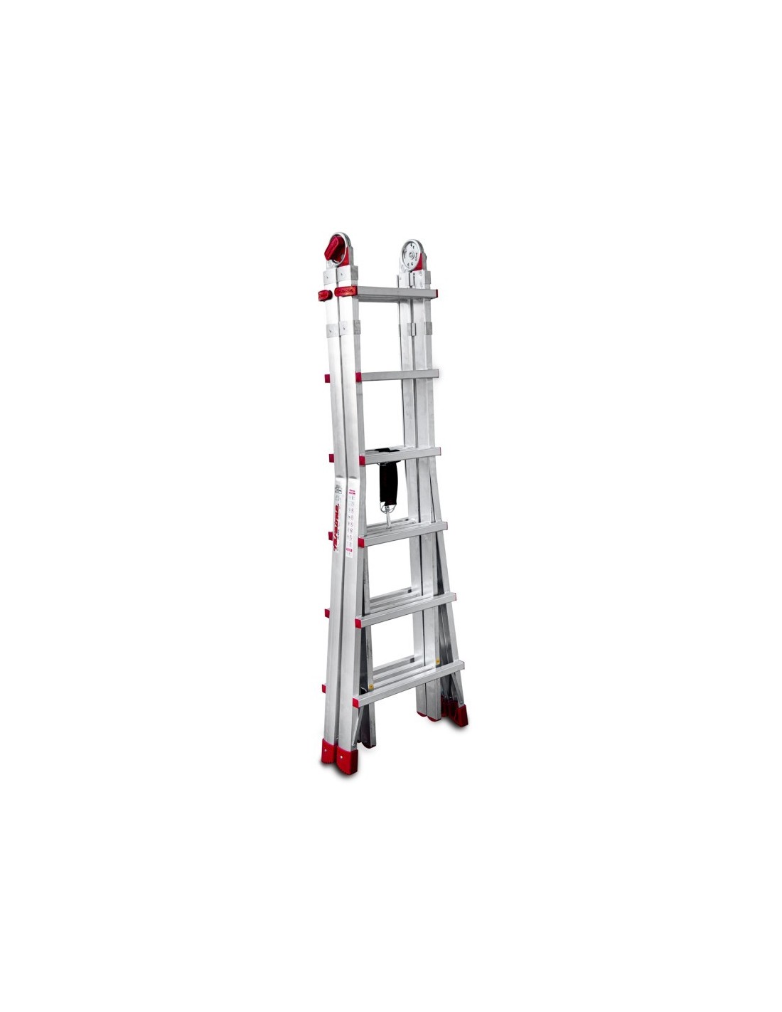 Escada profissional multiusos TELES de 12+12 degraus, fabricada em alumínio e com estabilizadores. Esta escada profissional possui estabilizadores amovíveis obrigatórios para cumprir as normas quando a escada é estendida. Além disso, esta escada multiusos possui dobradiças que permitem adotar a posição de trabalho desejada (autónoma, tesoura ou estendida) e um sistema de bloqueio em caso de fecho inesperado. É possível ajustar a altura graças à sua pega ergonómica.