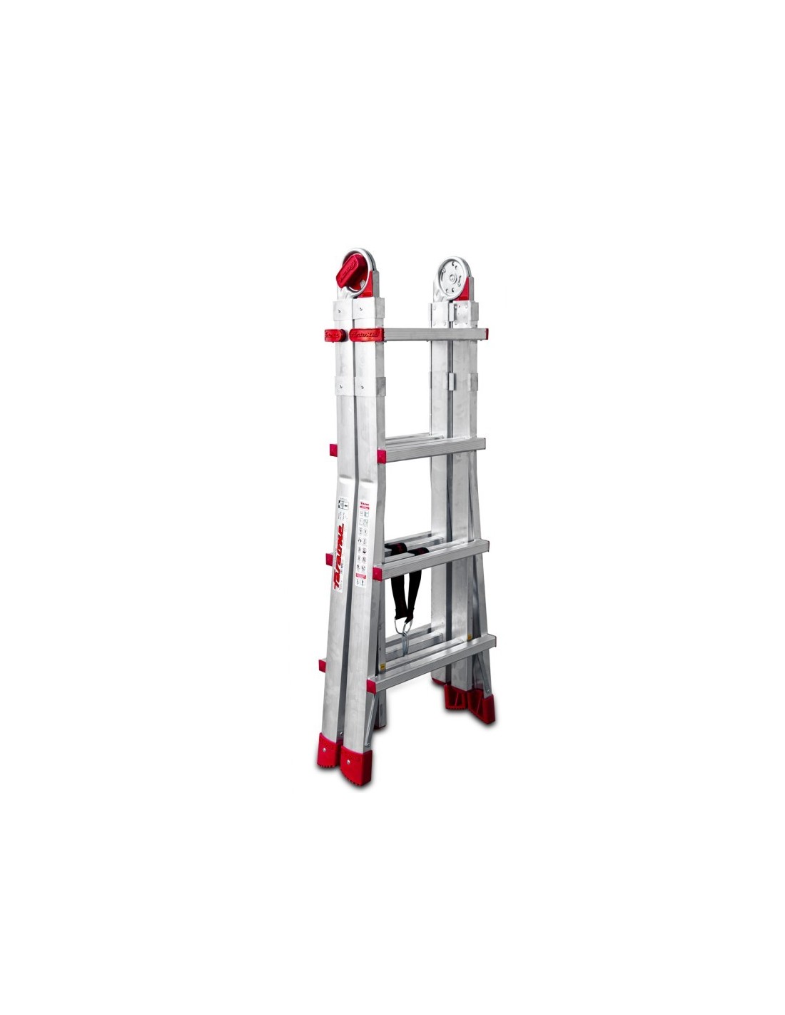 Escada profissional multiusos TELES de 8+8 degraus, fabricada em alumínio e com estabilizadores. Esta escada profissional possui estabilizadores amovíveis obrigatórios para cumprir as normas quando a escada é estendida. Além disso, esta escada multiusos possui dobradiças que permitem adotar a posição de trabalho desejada (autónoma, tesoura ou estendida) e um sistema de bloqueio em caso de fecho inesperado. É possível ajustar a altura graças à sua pega ergonómica.