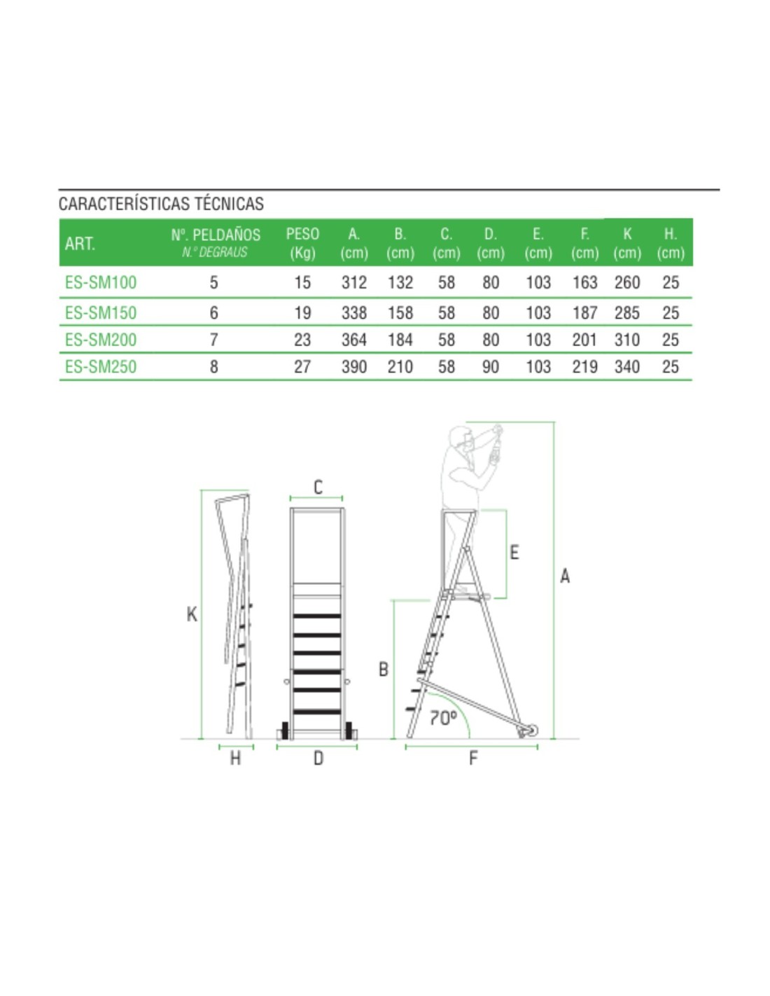 Escada dobrável profissional com 8 degraus. Esta escada de armazém é fabricada em alumínio e possui uma ampla plataforma de trabalho antiderrapante. Poderá deslocar esta escada de armazém profissional com grande facilidade graças às duas pegas que lhe permitem levantá-la e movê-la graças às suas rodas.